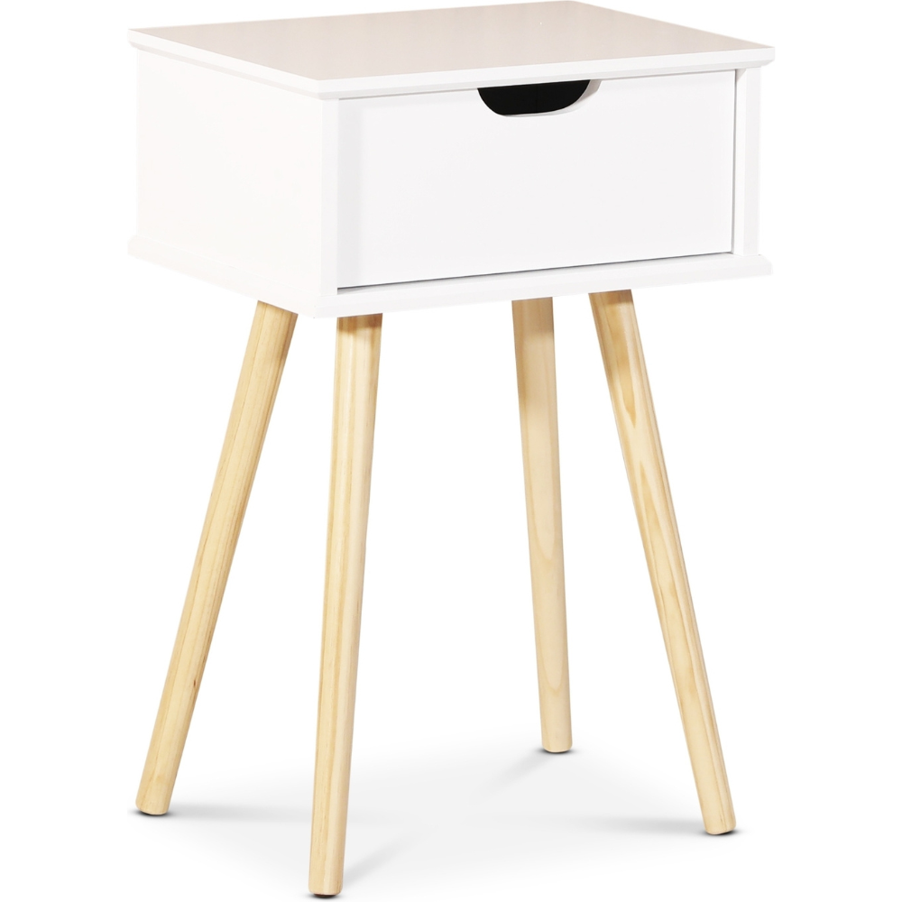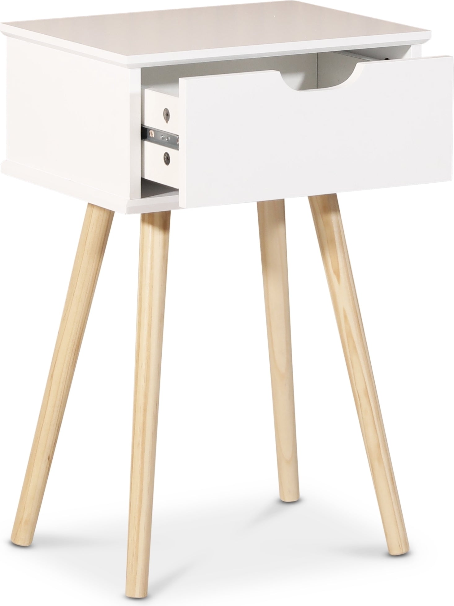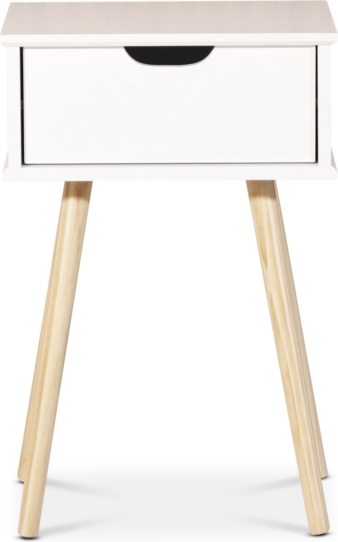 Ett charmigt sängbord i lantlig stil med vit stomme, en låda med träfront och ett nedre hyllplan.