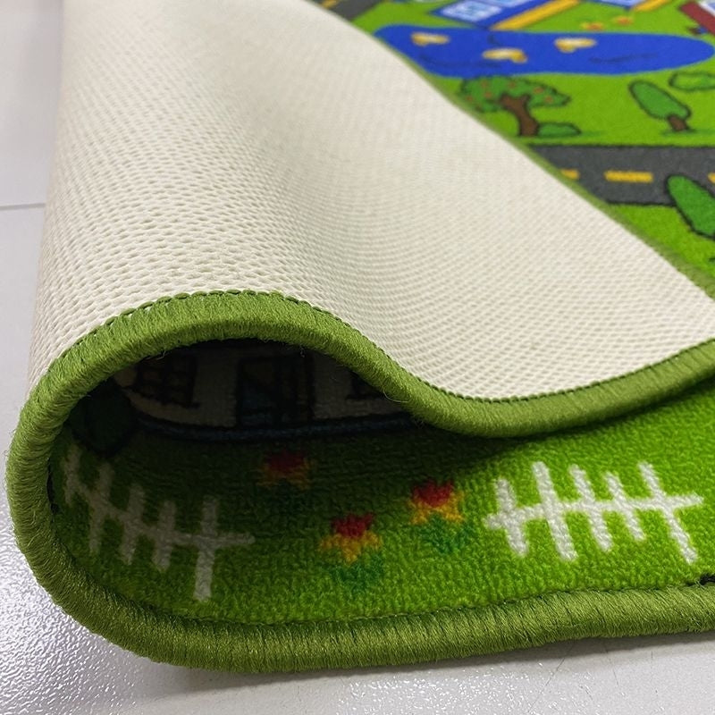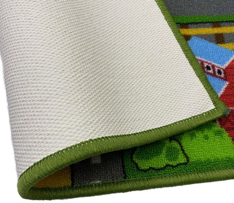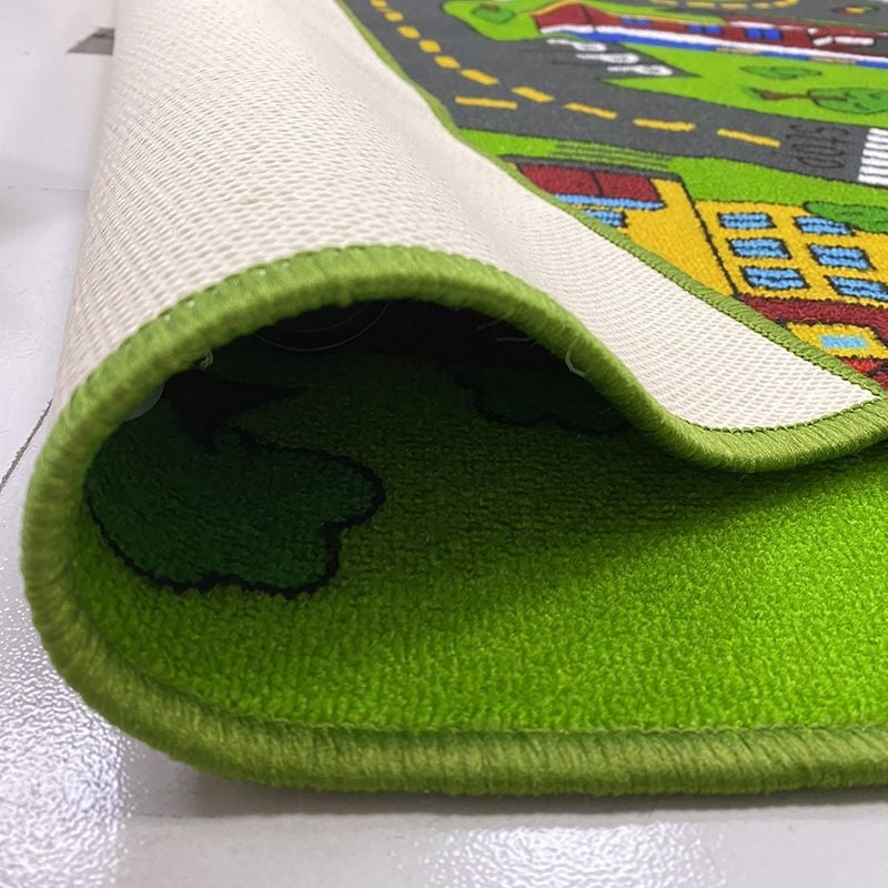 Lekfull vägmatta till barnens lekrum. Tillverkad i polyester med latex på undersidan som halkskydd.