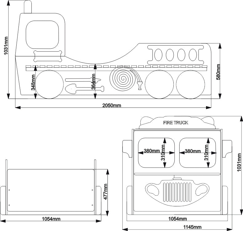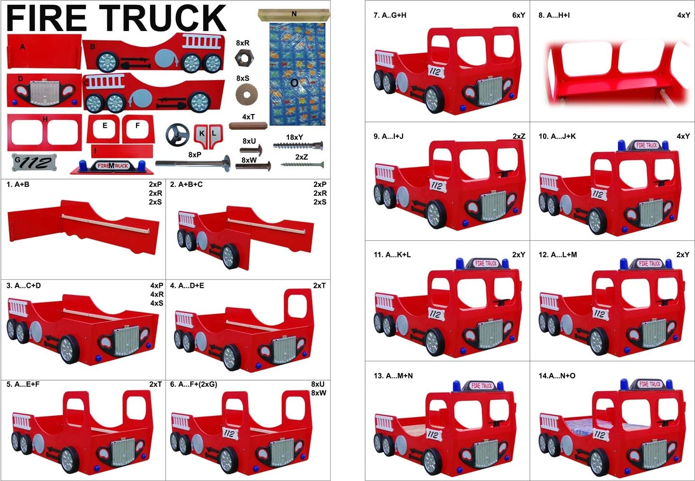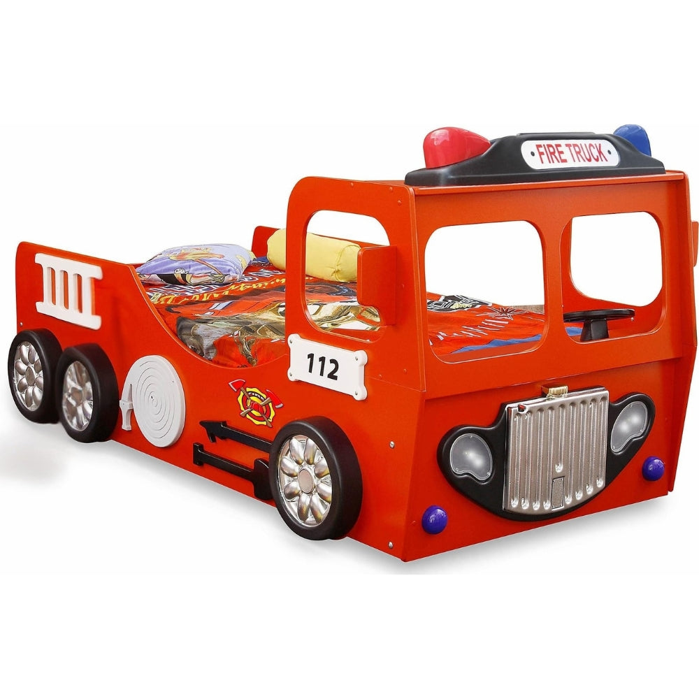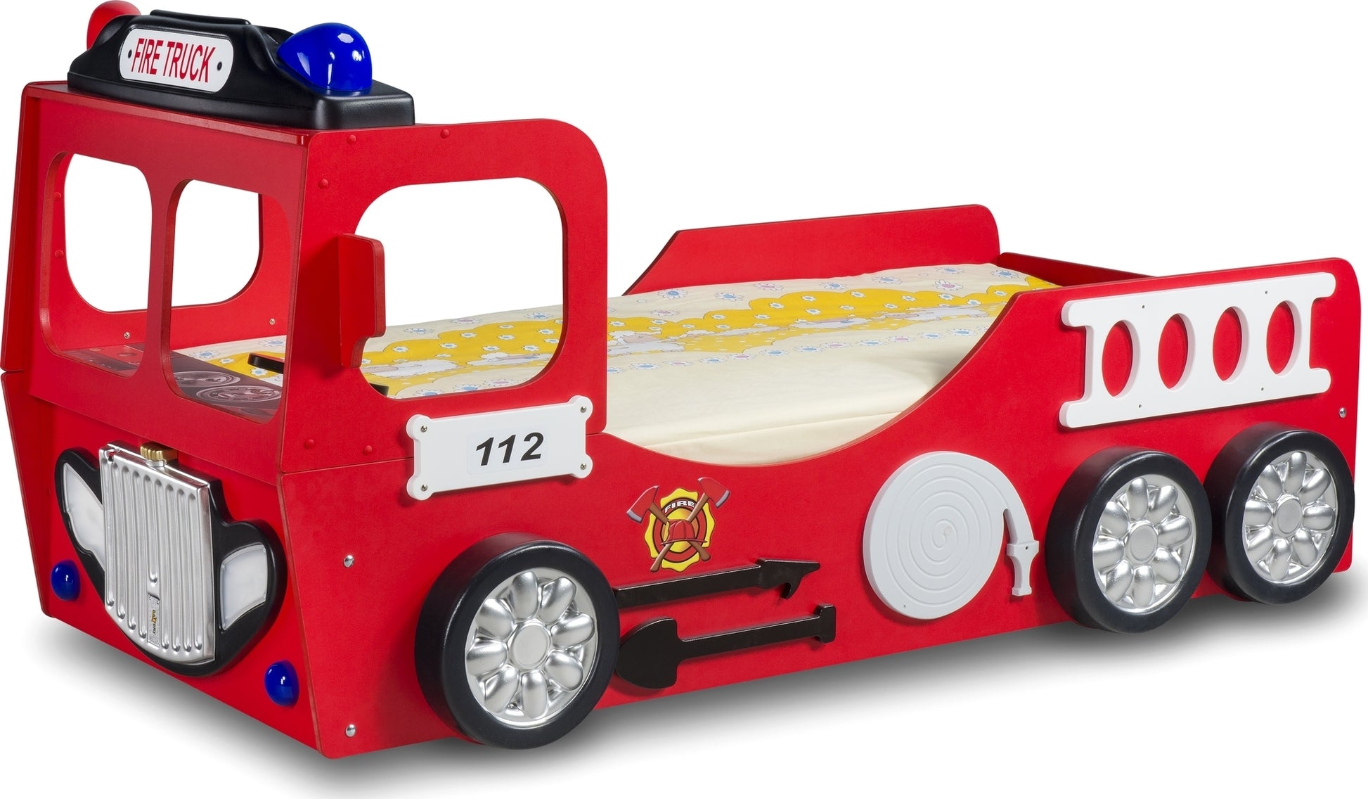 En rolig och fantasifull barnsäng utformad som en brandbil, komplett med tuffa detaljer och LED-lampor som kan användas som nattlampa.