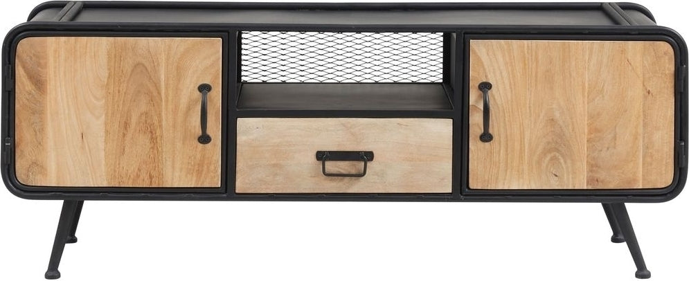 En mediabänk med en rustik och industriell känsla. Dörrarna har ett vackert fiskbensmönster och möbeln vilar på en stabil metallram.