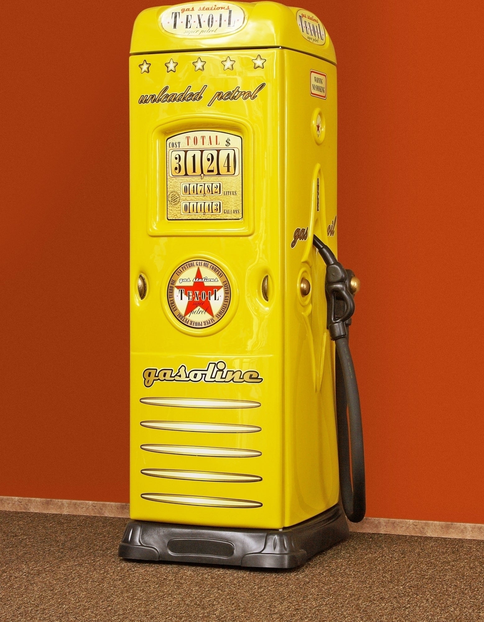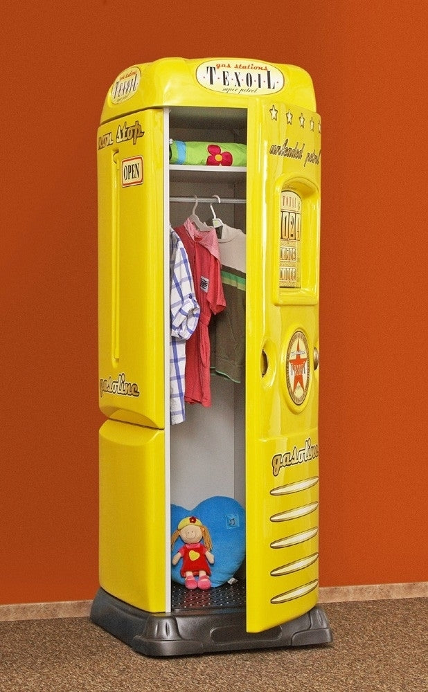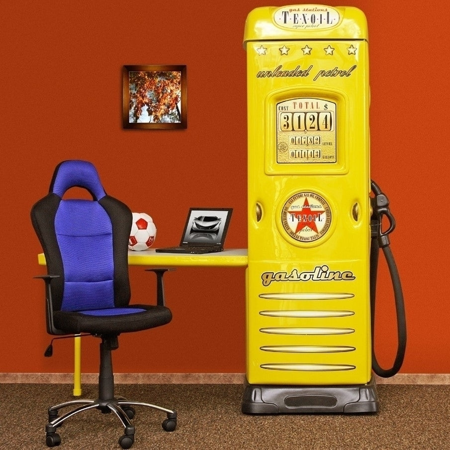 En unik och multifunktionell barnmöbel designad som en bensinpump. Innehåller både garderob, förvaringshyllor och ett praktiskt nedfällbart skrivbord.