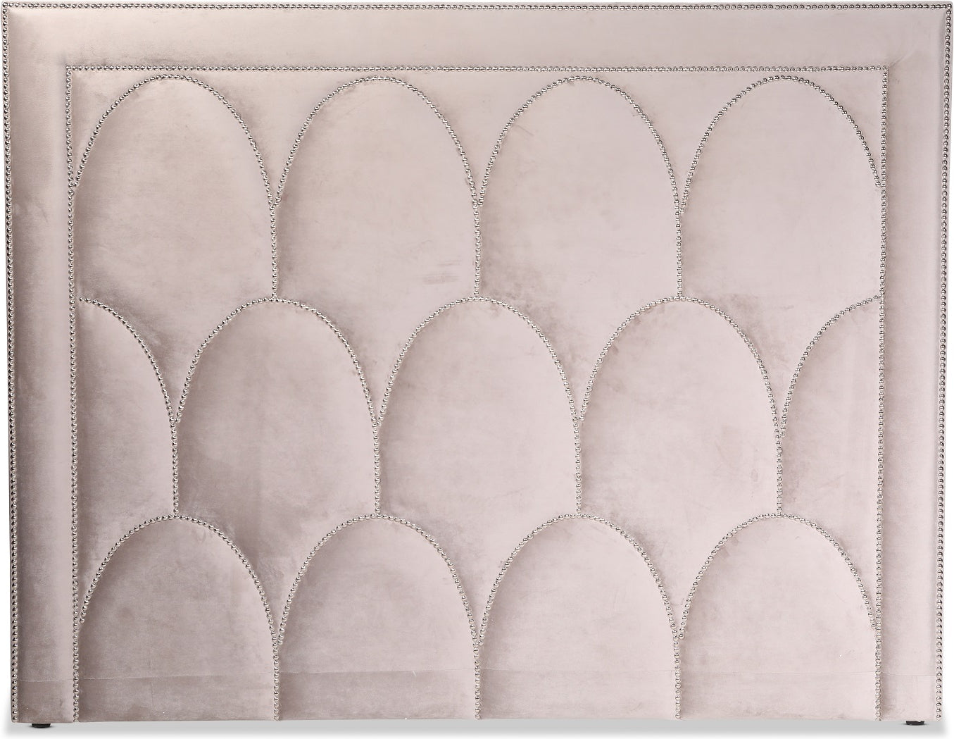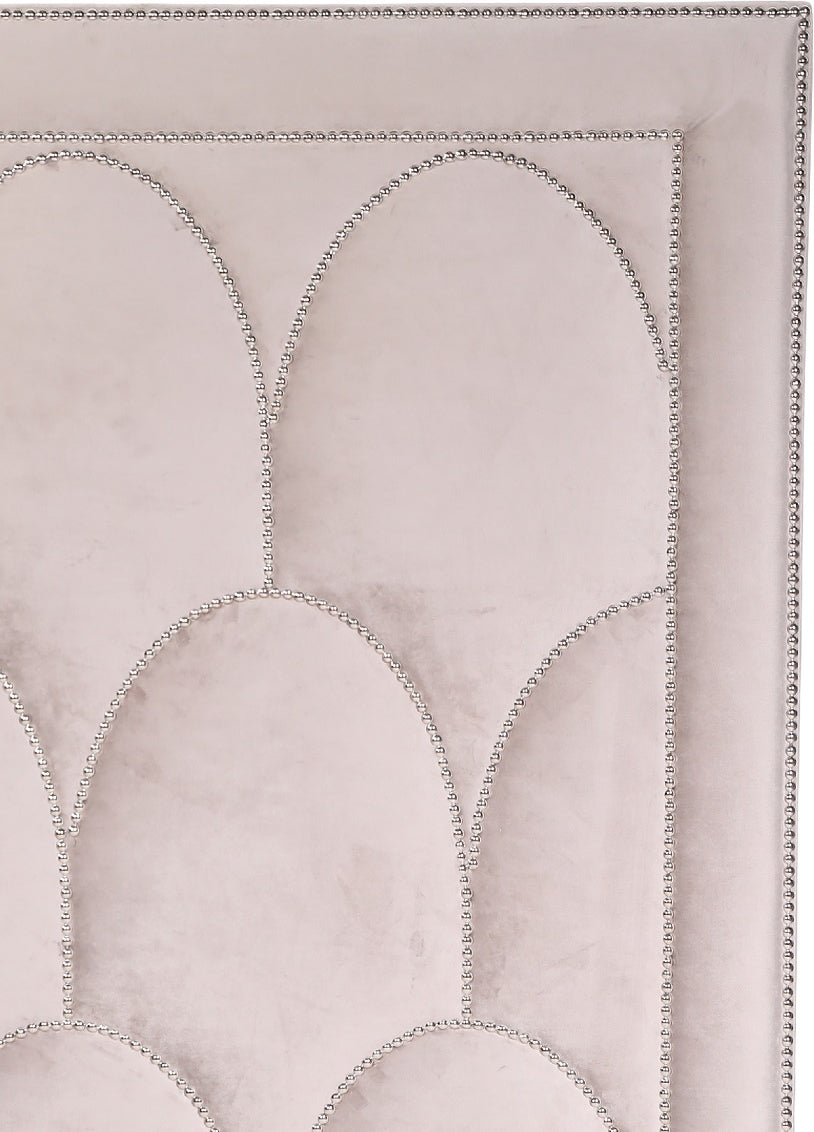 En elegant sänggavel med vingar på sidorna och en ram av silverfärgade nitar som ger en lyxig känsla.