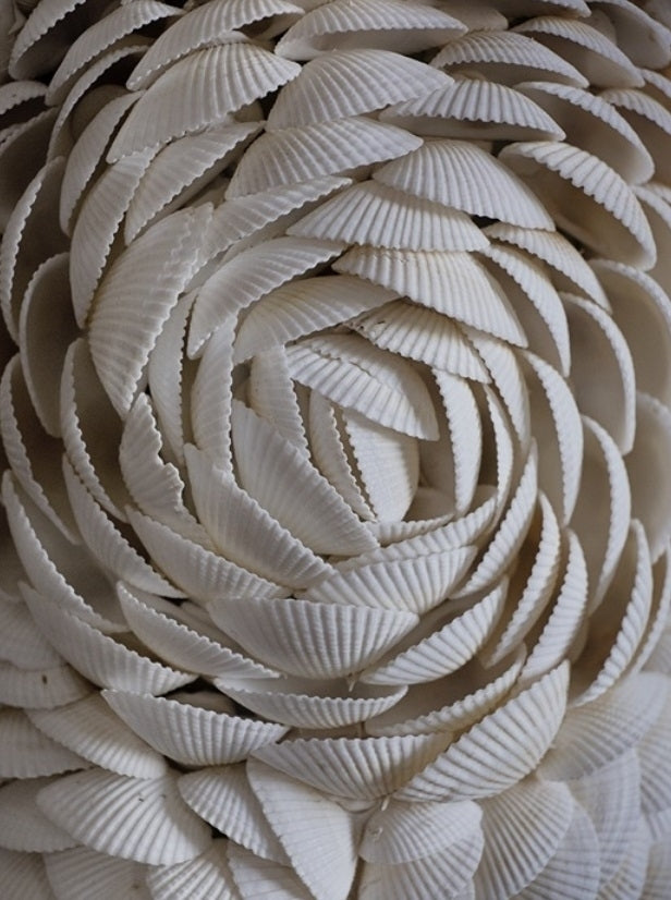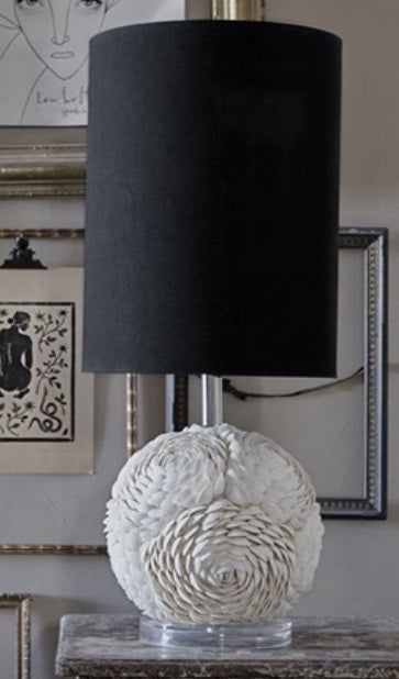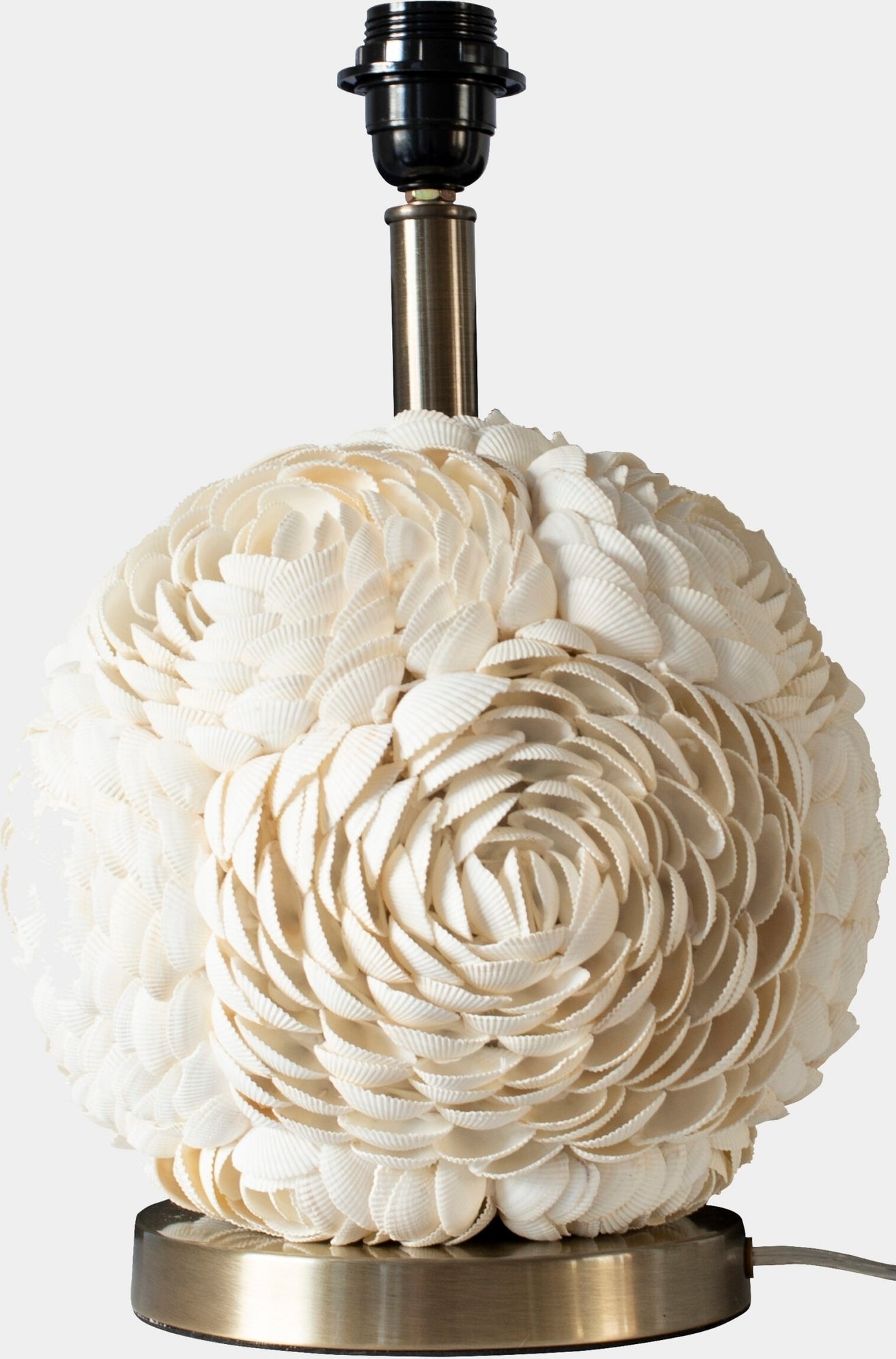 En unik och iögonfallande lampfot där basen är en glasbehållare fylld med vackra snäckskal.