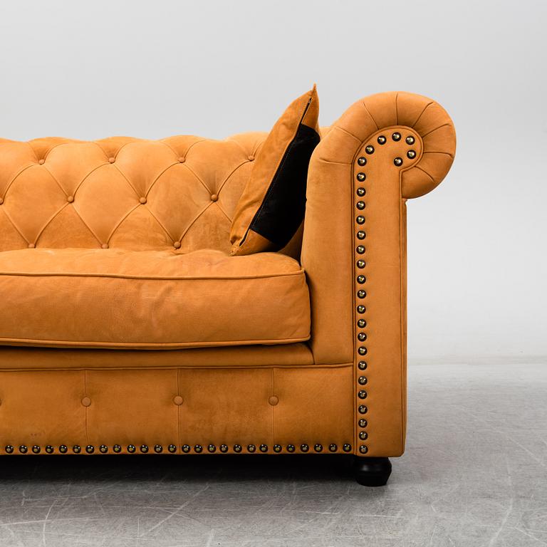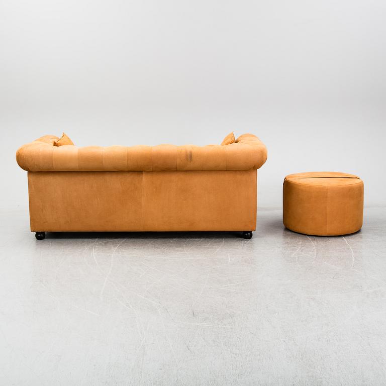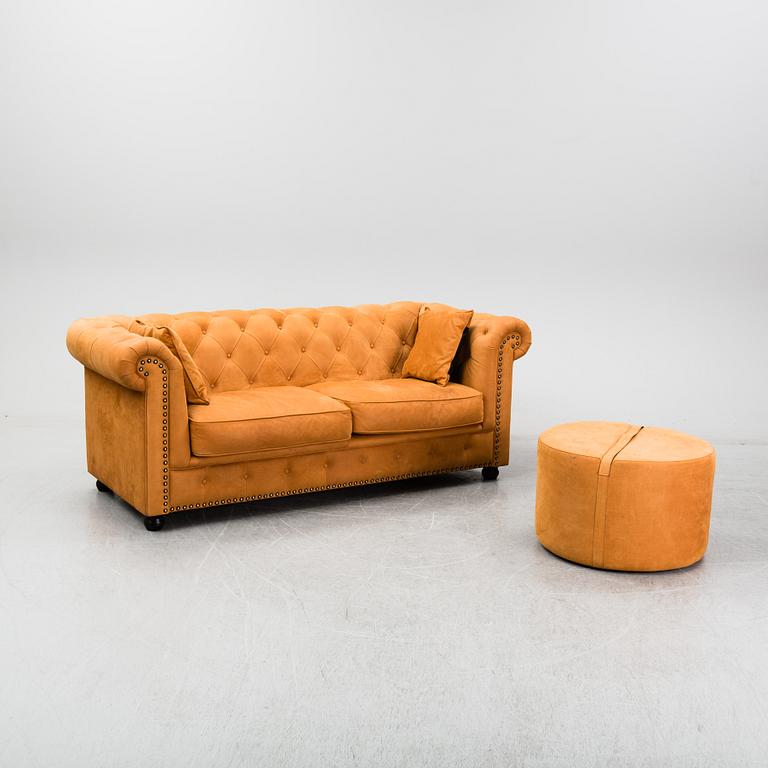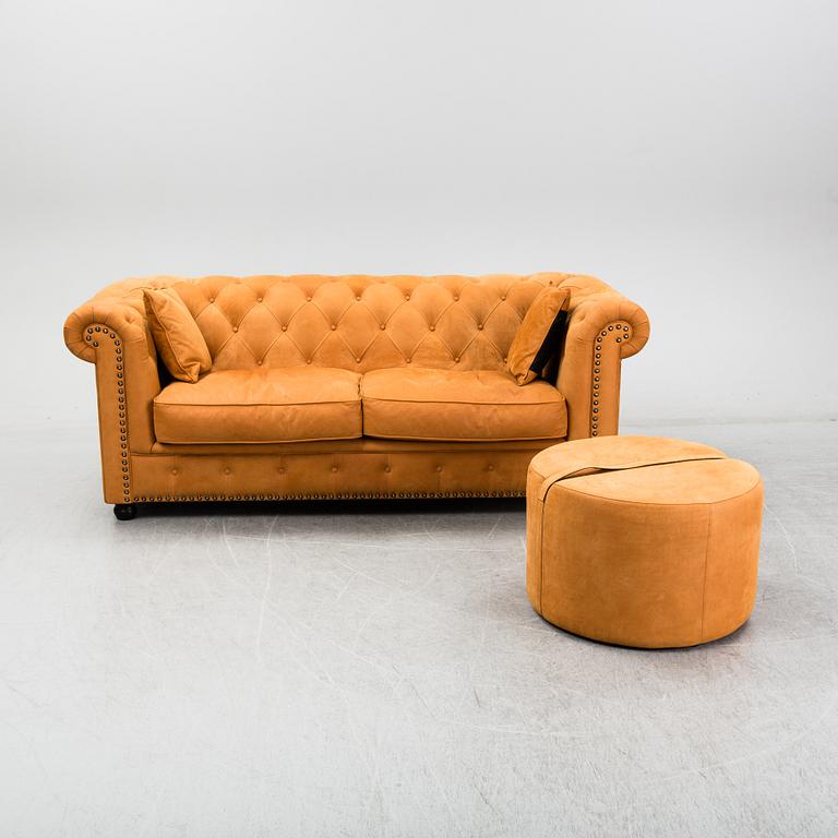En soffa för dig som är ute efter något klassiskt och tidlöst. Perfekta färgklicken i hemmet som ger aldrig går ut ur stil. Soffan med två lösa sittdynor samt två kuddar, djuphäftad och med dekor av metall nitar. Längd 215, bredd 100, sitthöjd ca 50, höjd 85 cm. Pallens diameter 70, höjd 45 cm.