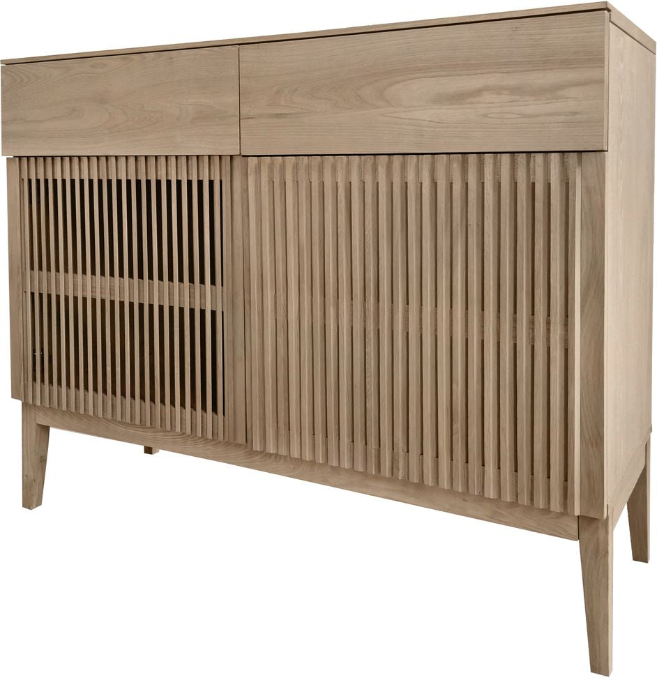 Ett modernt och elegant vitrinskåp med en stomme i ljus ask och skjutdörrar i glas. Perfekt för förvaring och display.