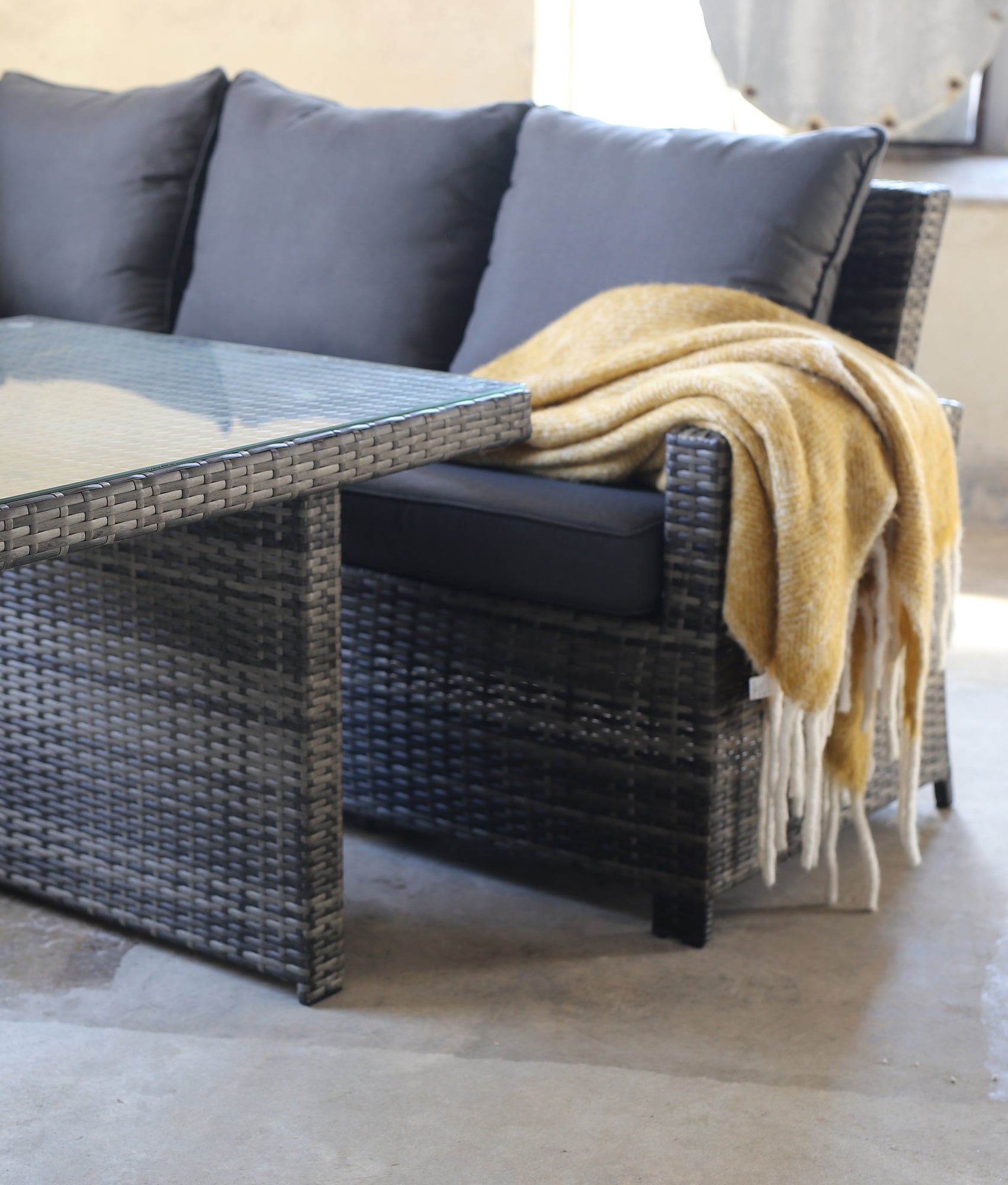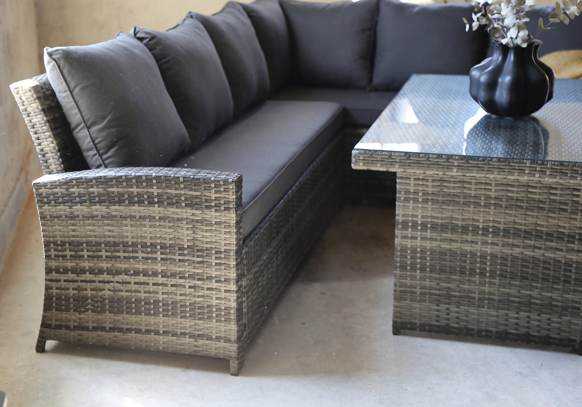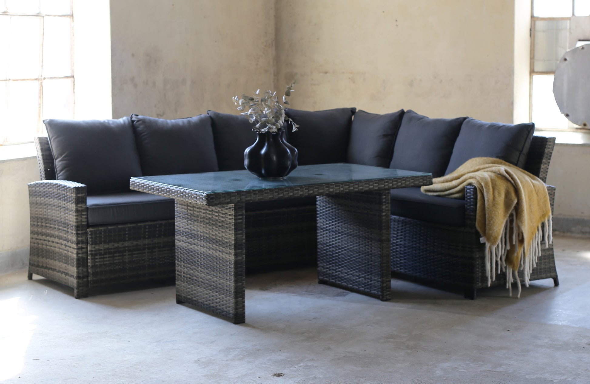 En stilren och kompakt hörnsoffa för uteplatsen. Tillverkad i väderbeständig konstrotting med en stabil aluminiumstomme. Dynor och soffbord ingår.