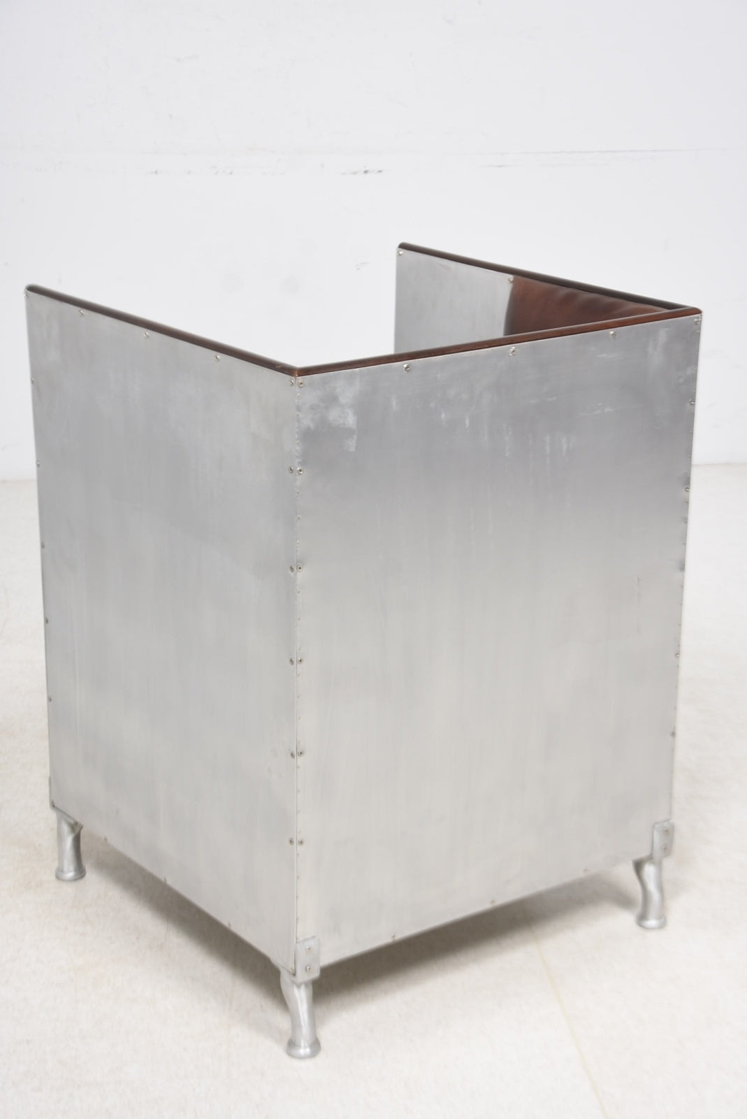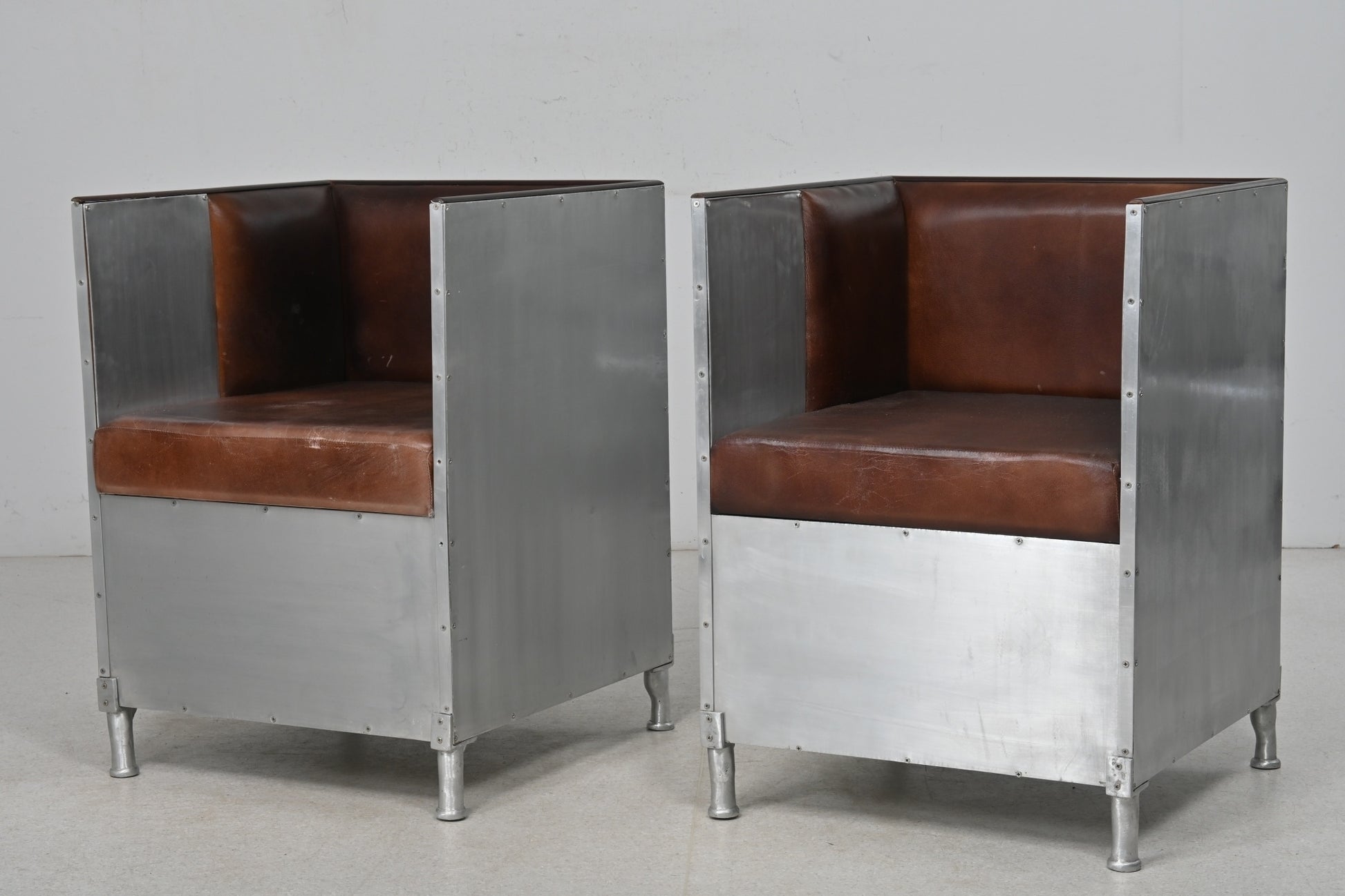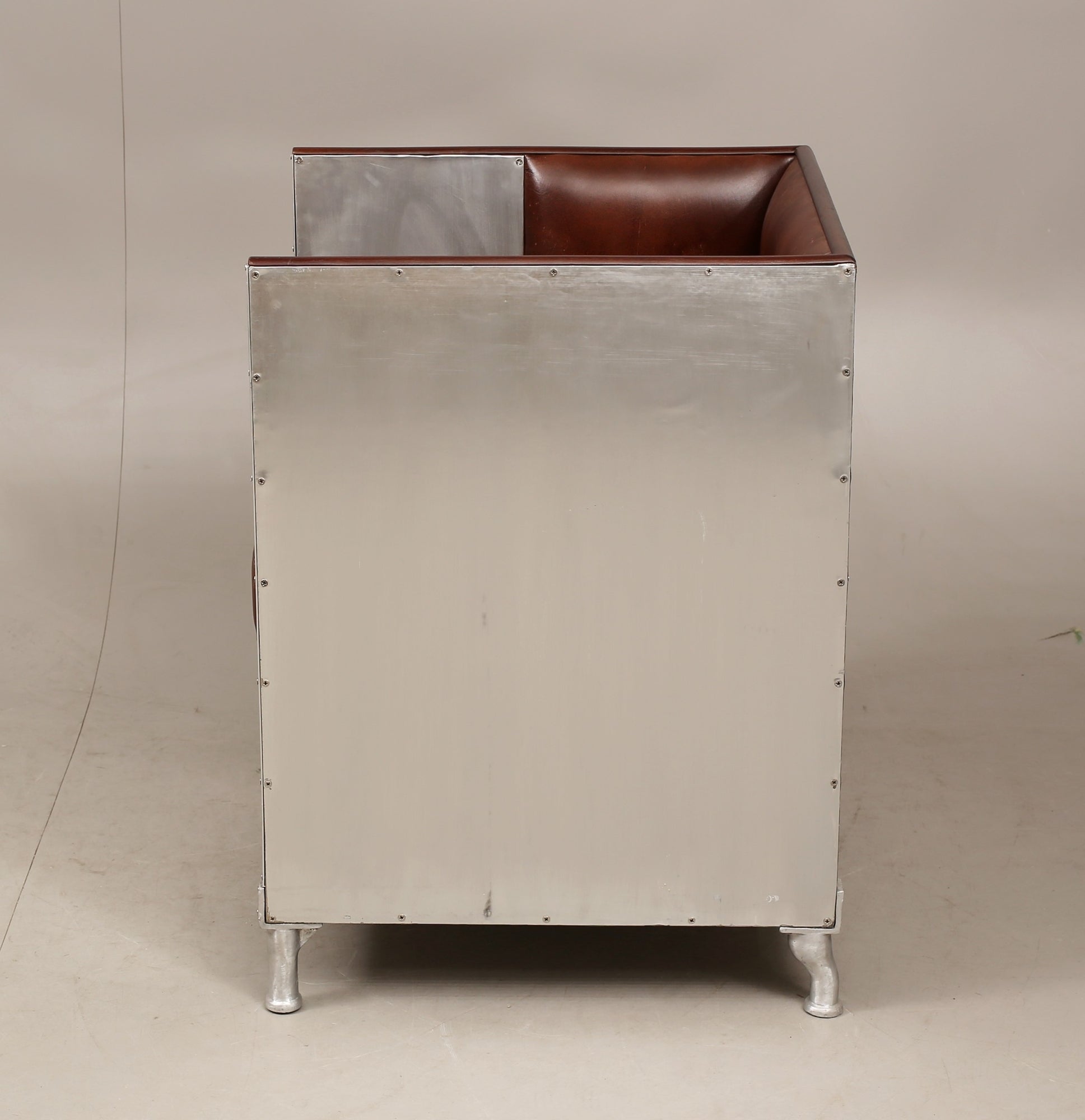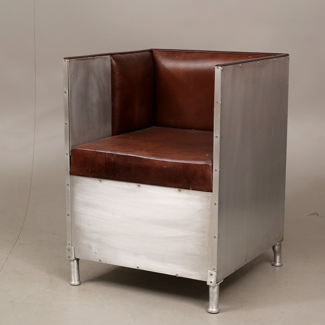 En exklusiv och stilren fåtölj i industriell design med en sits och rygg av mörkbrunt läder och en robust metallram.