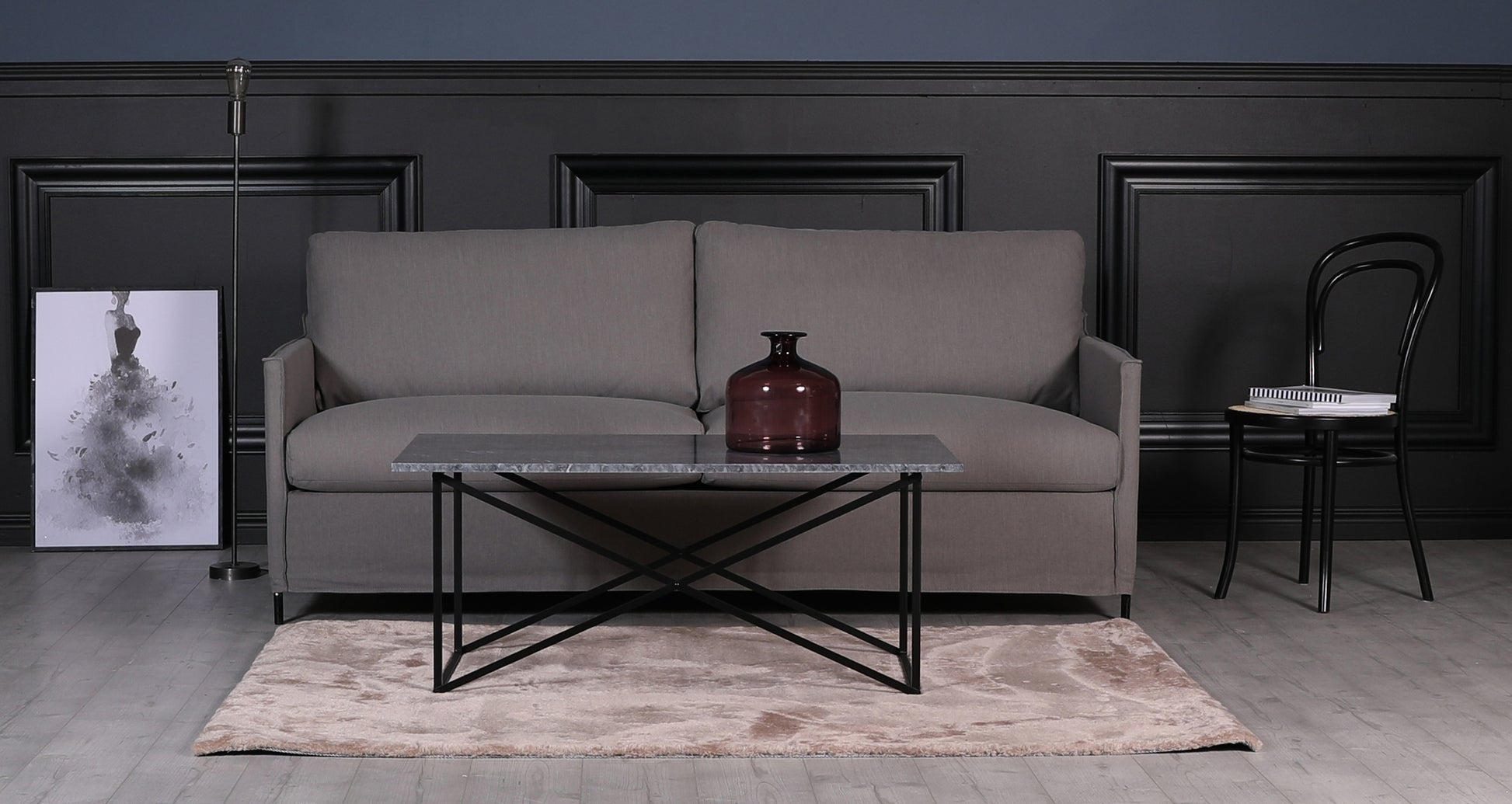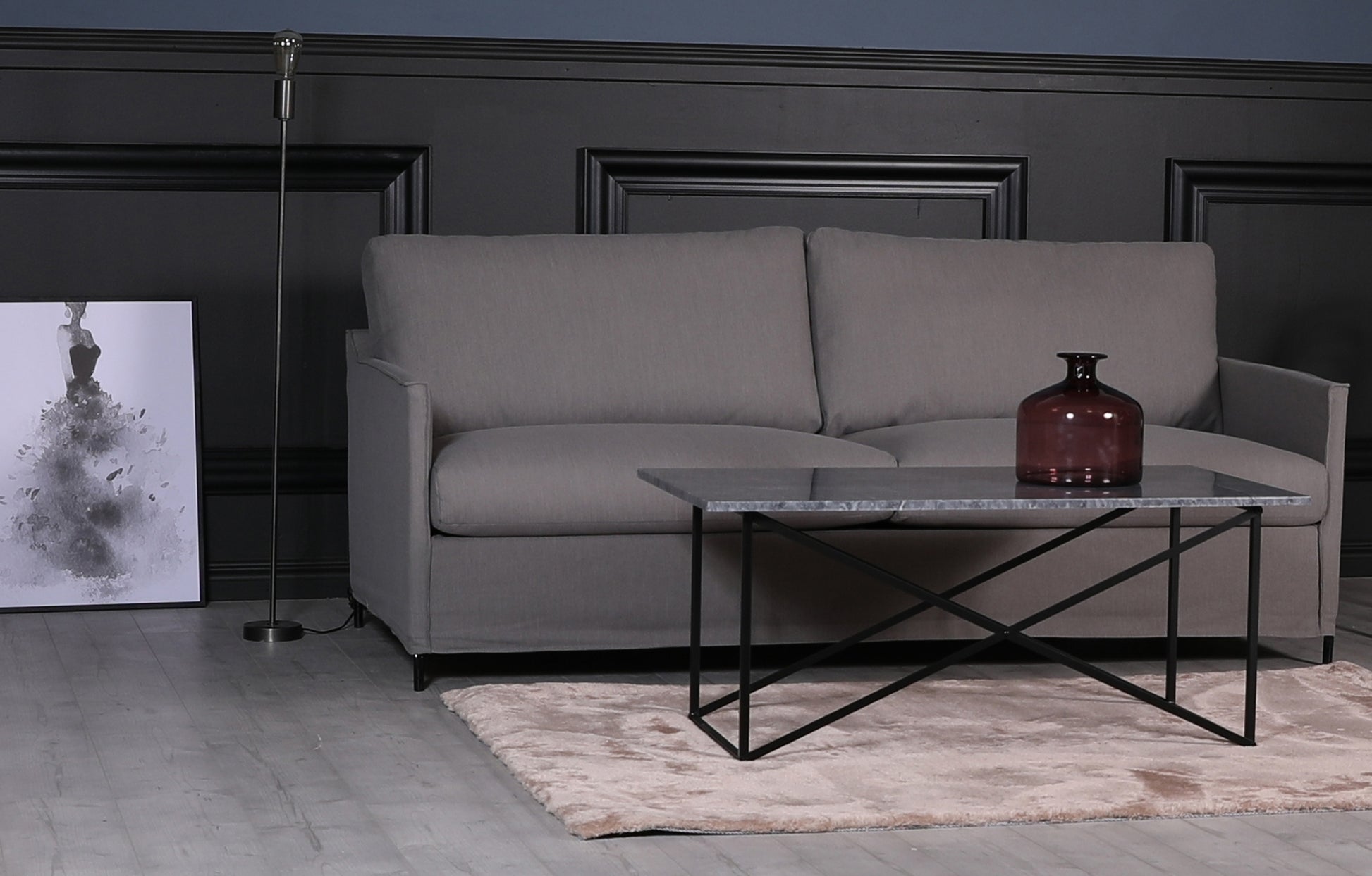 Stoppning: Kallskum och fjäder, Klädsel: Avtagbart gråbrunt linnetyg