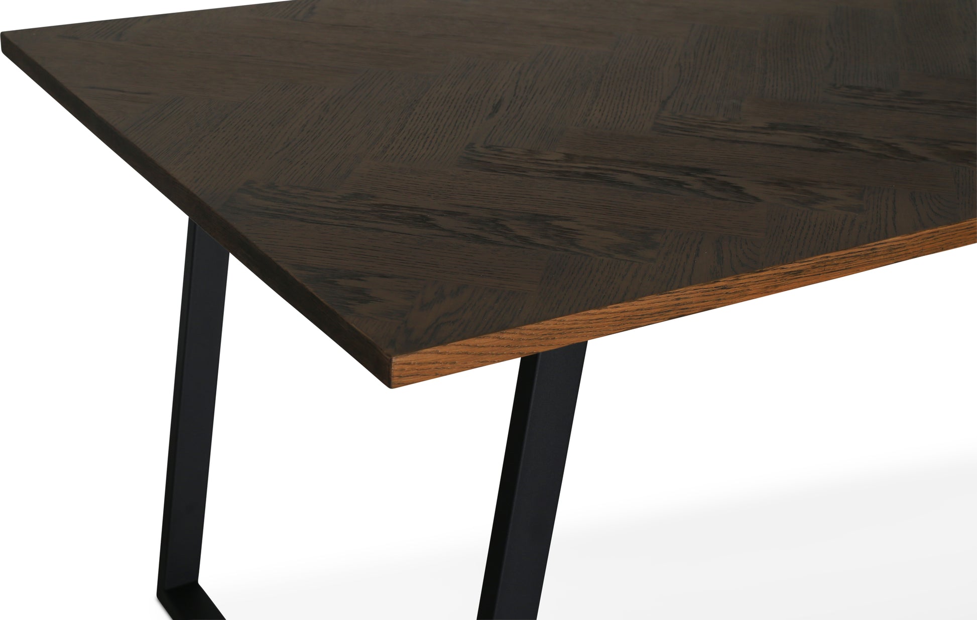 Ett exklusivt matbord från serien Edge med en vacker skiva av brunbetsad ekfanér lagd i fiskbensmönster.
