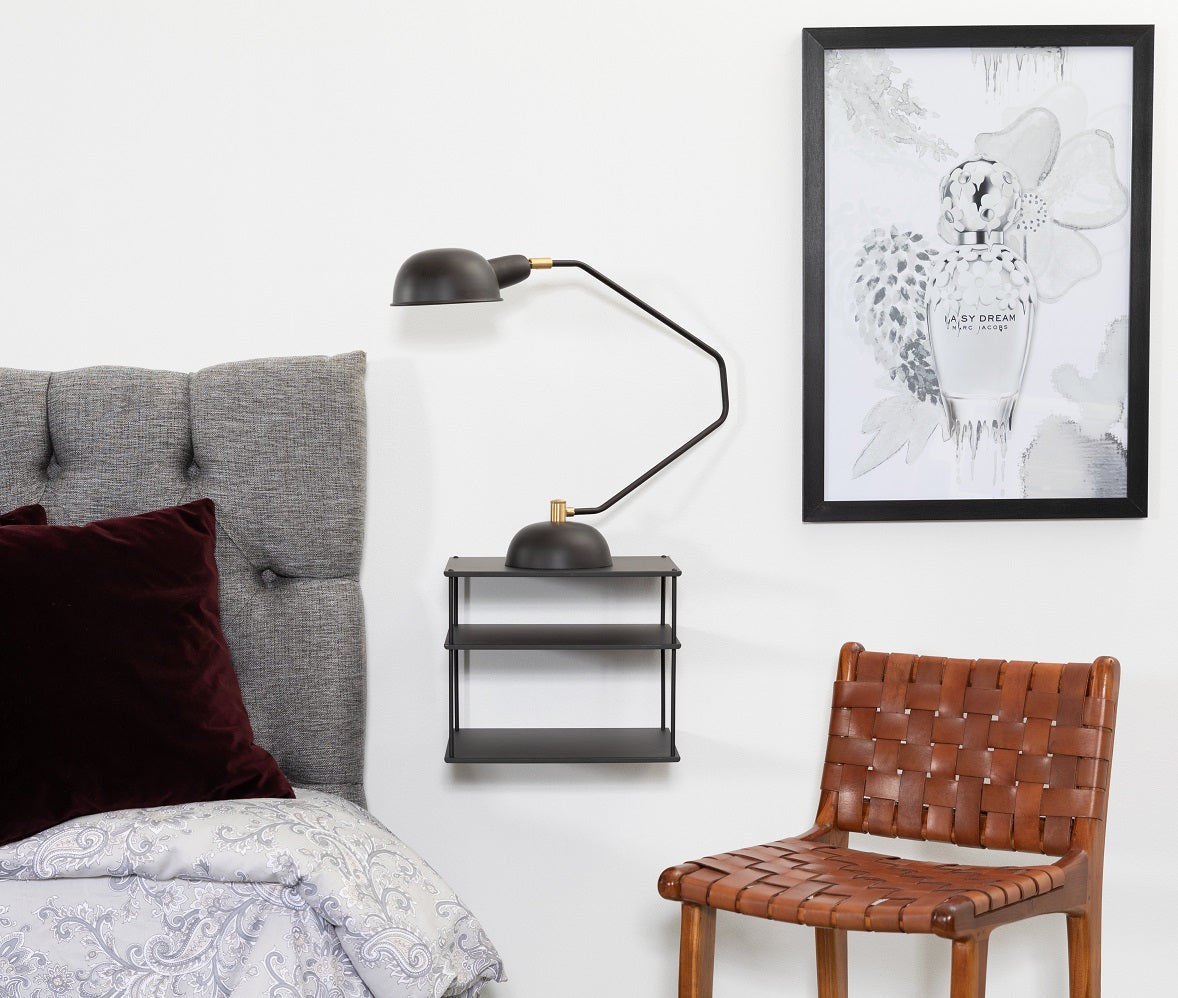 Ett smidigt och minimalistiskt vägghängt sängbord med en låda. Den vägghängda designen förenklar städningen och ger ett luftigt intryck.