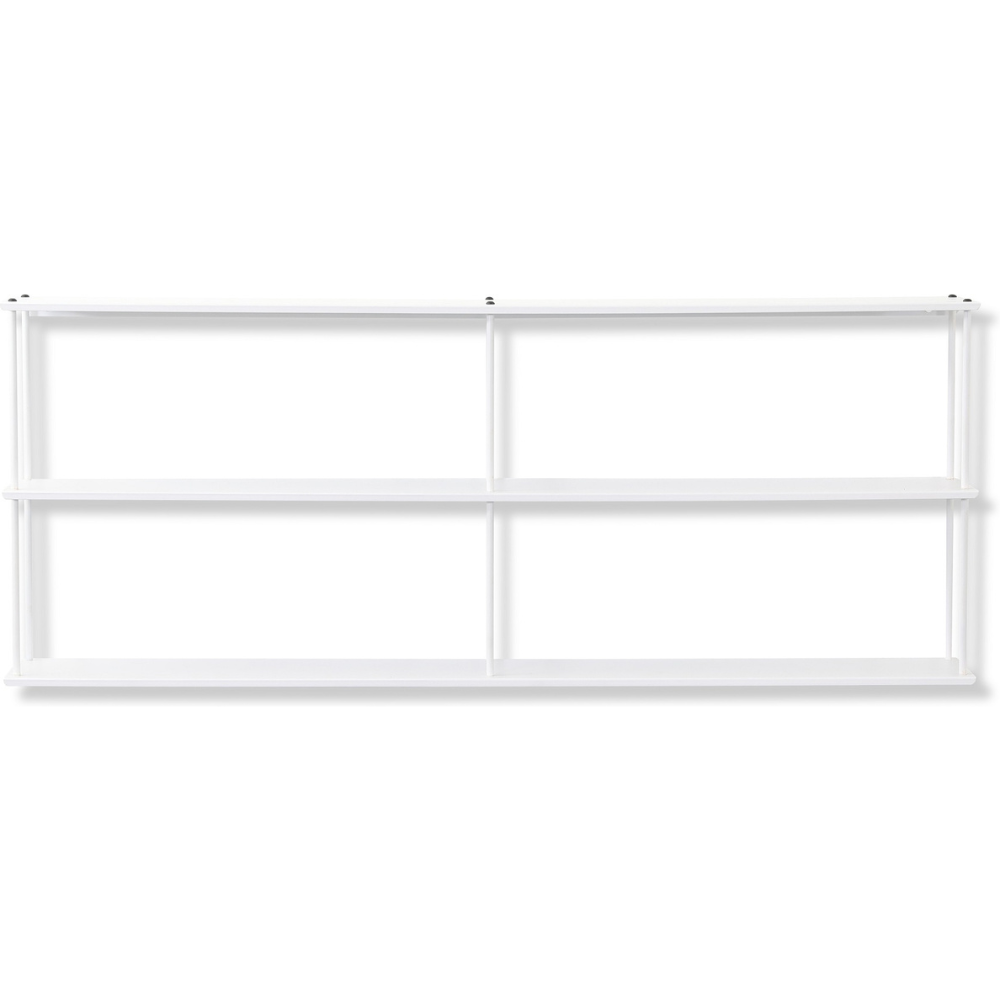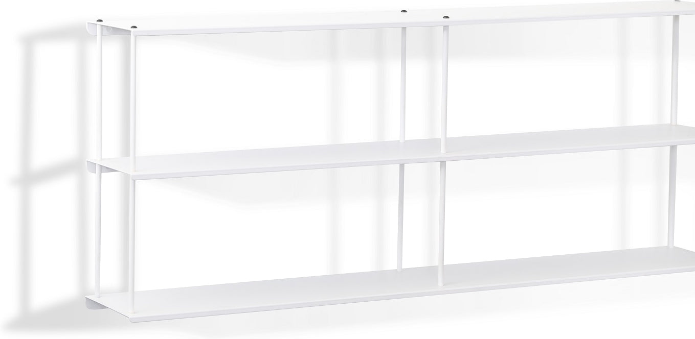 En stilren och dekorativ vägghylla i vit metall. Den runda formen och de assymetriska hyllplanen skapar en ljus och modern design.
