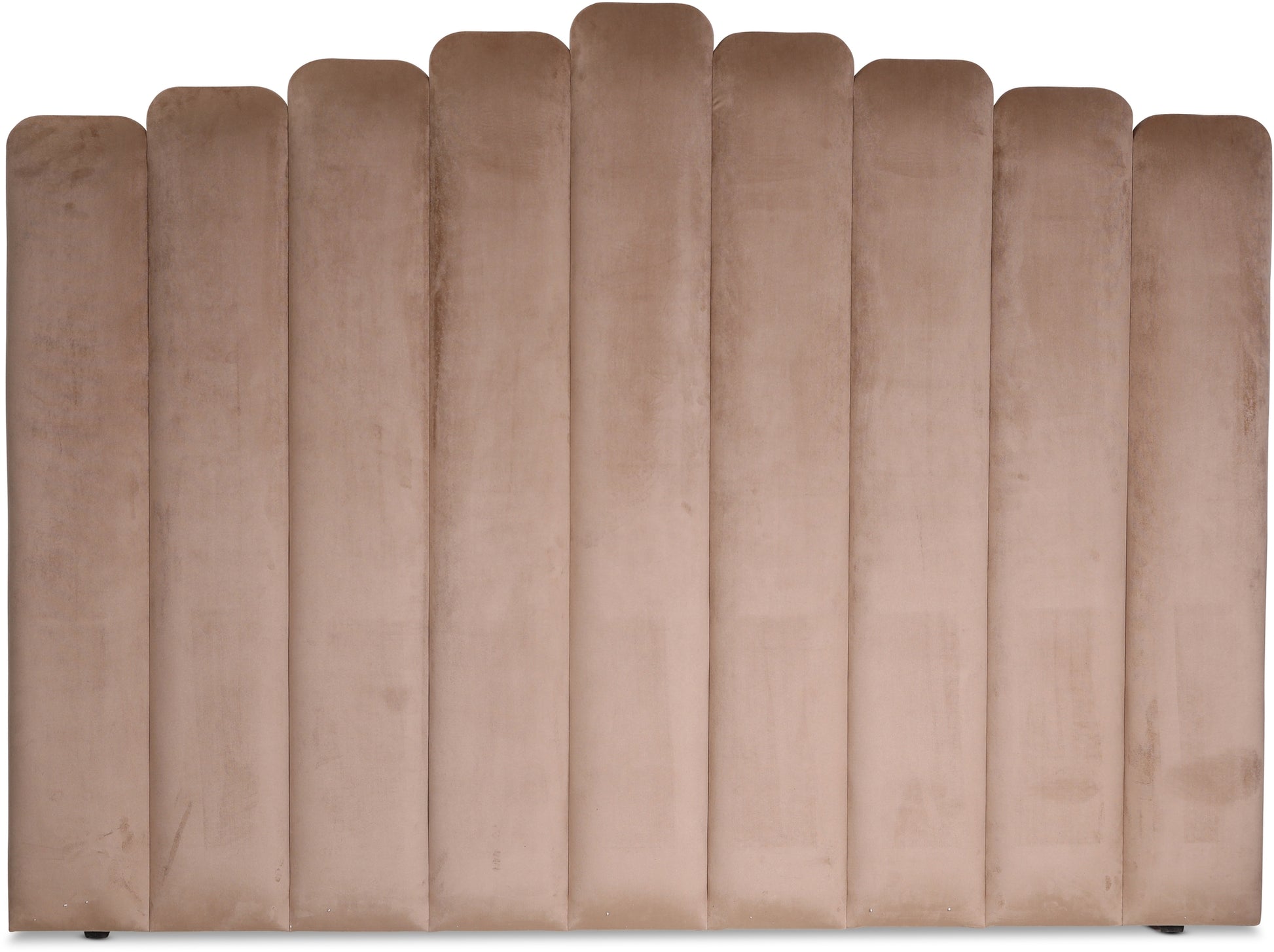 En pikerad sänggavel klädd i mjukt, beiget sammetstyg. De djupt häftade knapparna skapar ett elegant och klassiskt mönster.