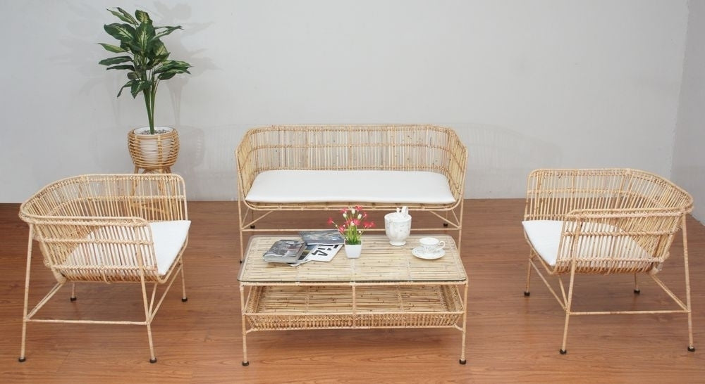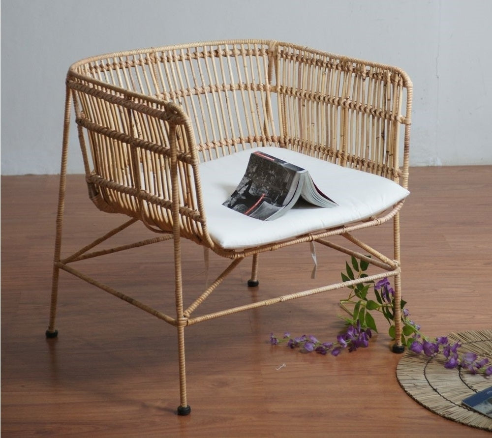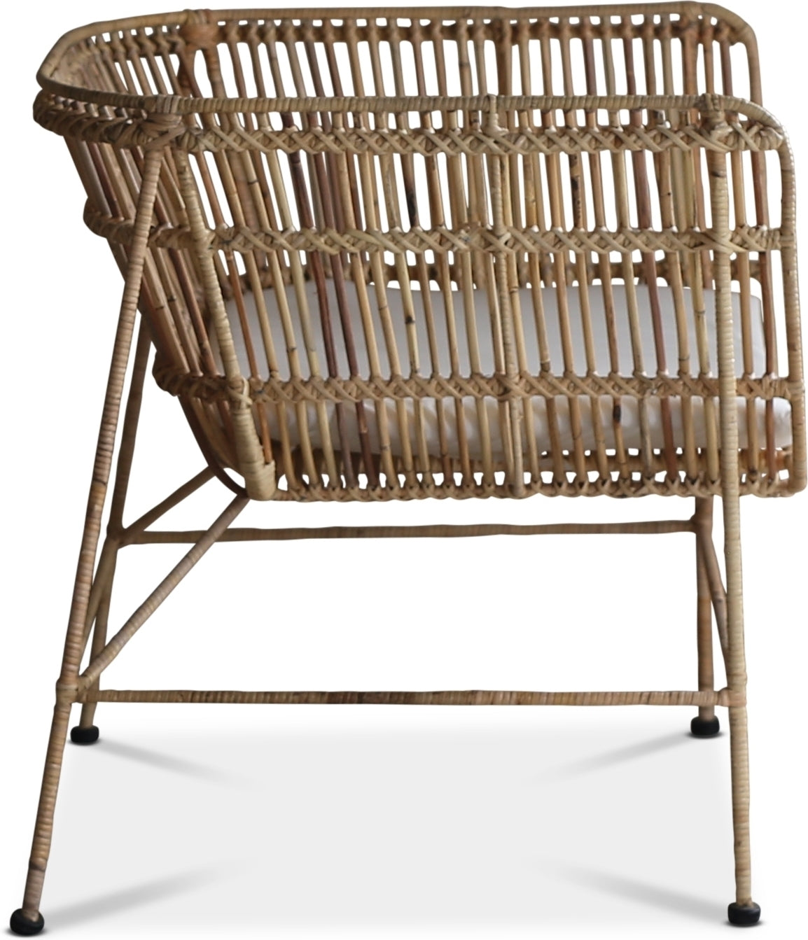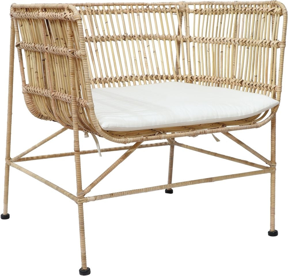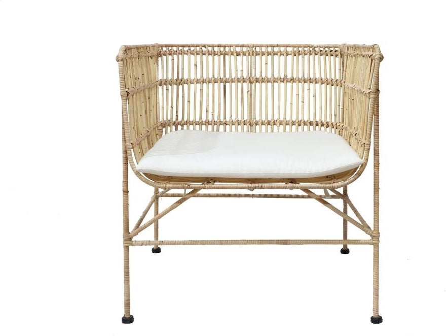 En vacker och bekväm fåtölj i naturrotting med en mjuk, vit sittdyna.