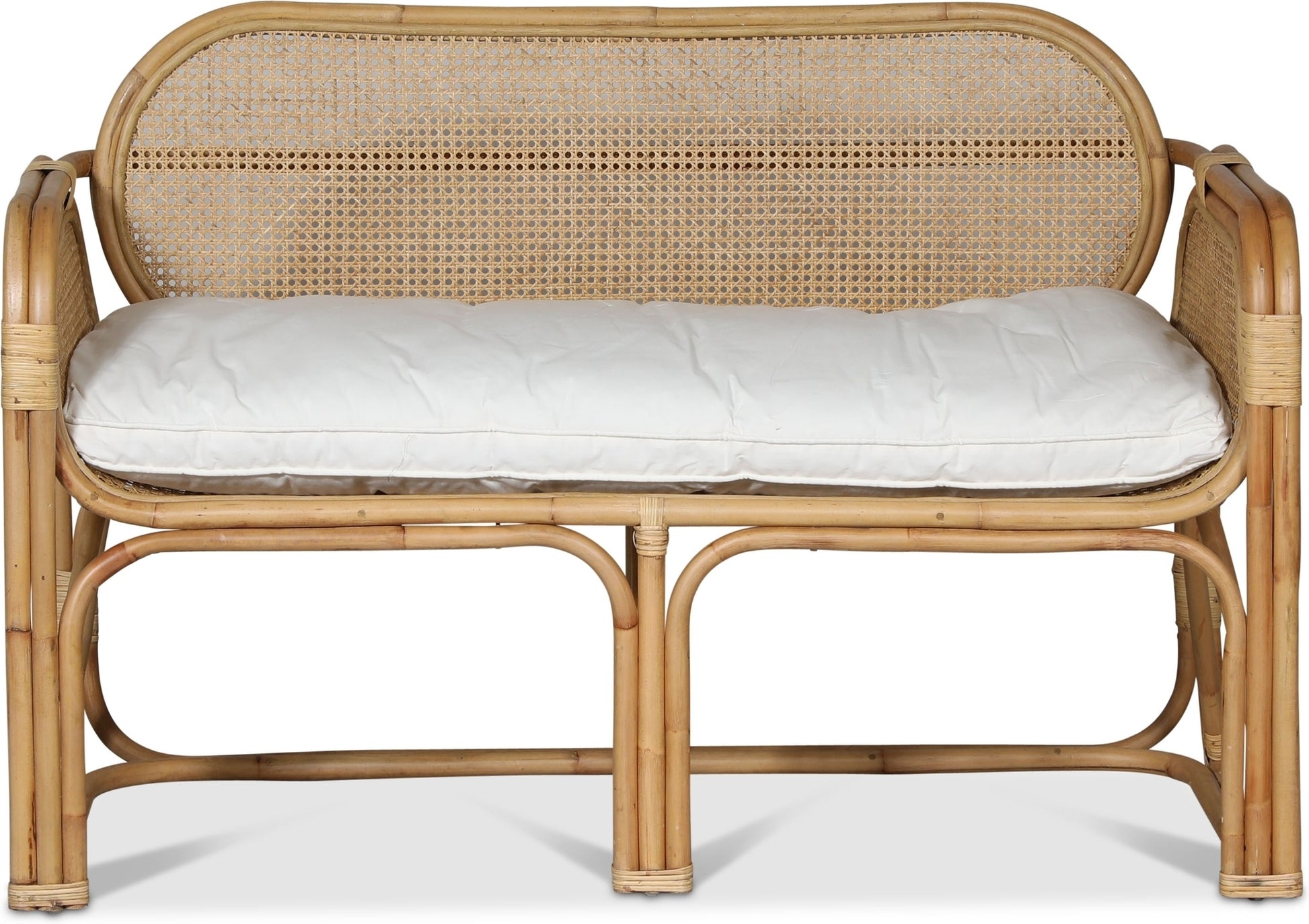 En charmig och bohemisk 2-sits soffa tillverkad i bambu med en vacker väv av rotting. Perfekt för uterummet eller en ombonad hörna.