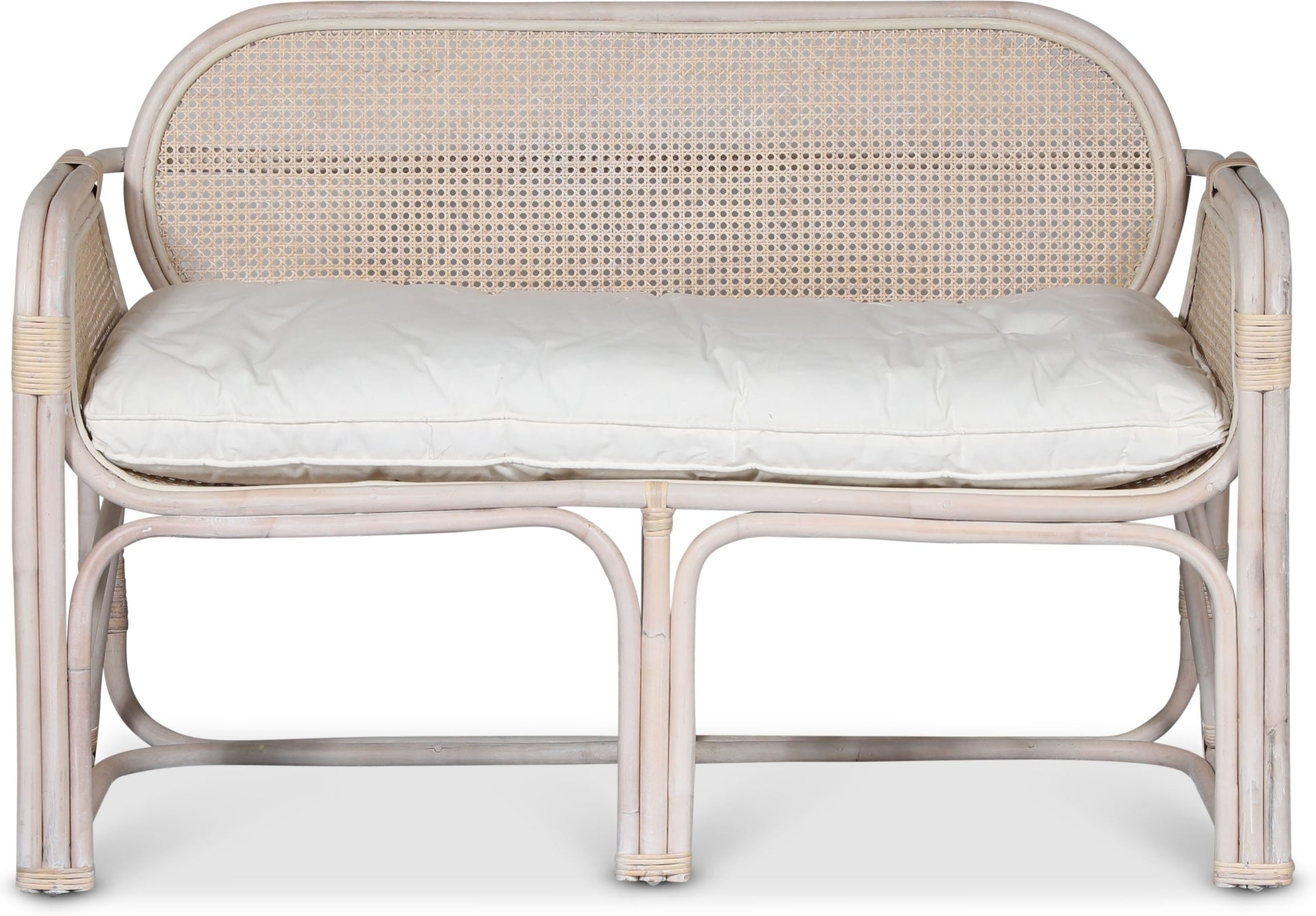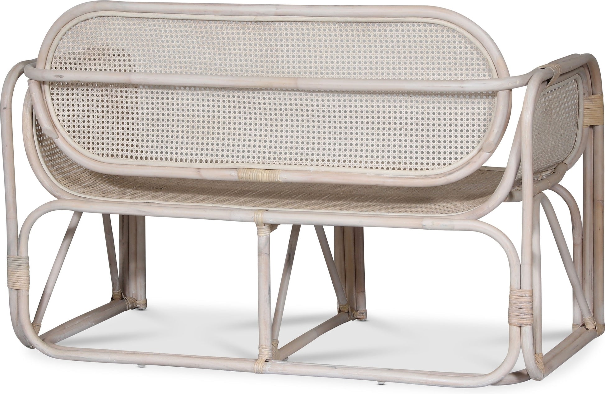 En charmig och bohemisk 2-sits soffa tillverkad i bambu med en vacker väv av rotting. Den vitkalkade finishen ger ett ljust intryck.