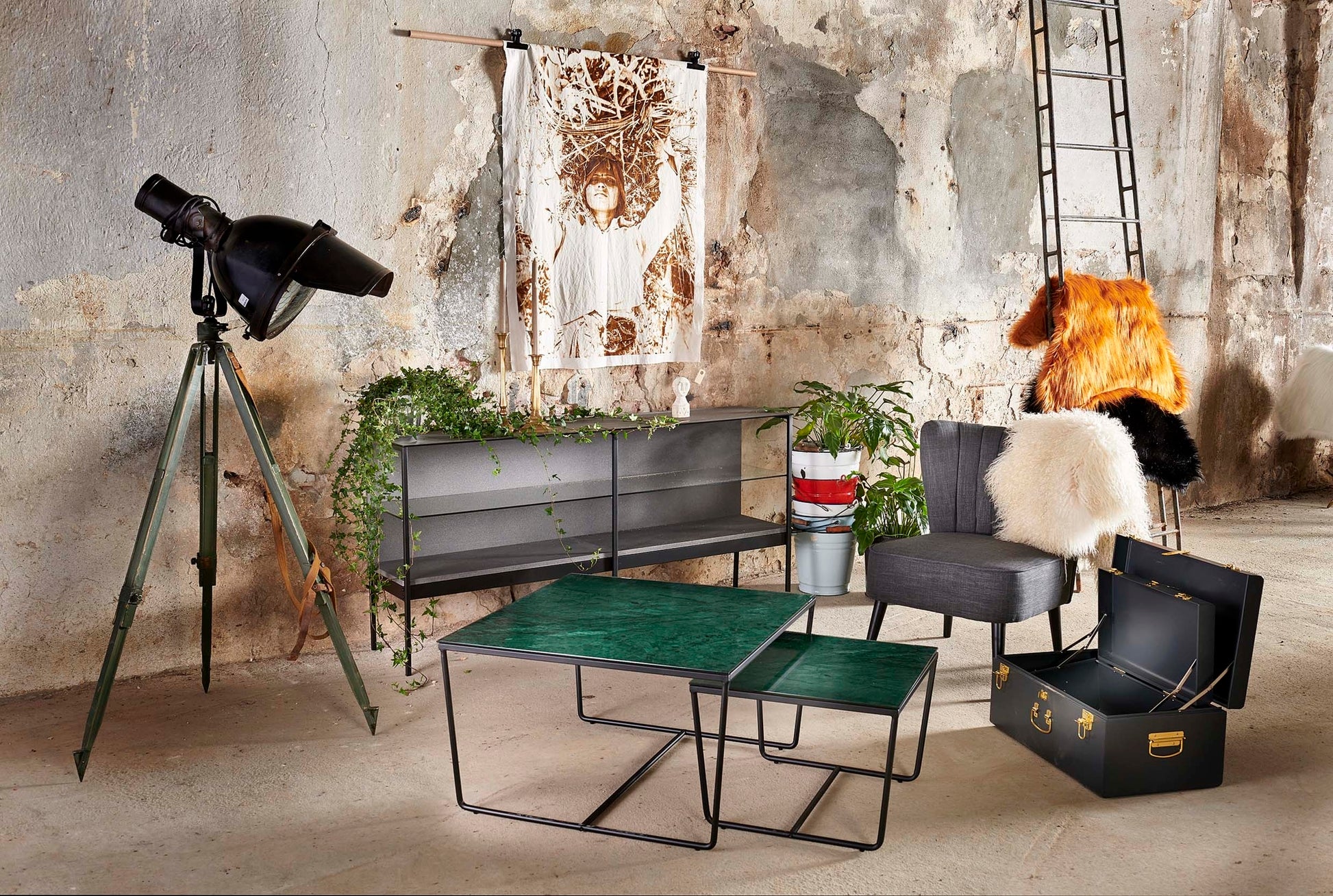 Ett satsbord i två delar med gröna glasskivor med marmormönster och mässingsfärgad ram. Den smarta designen gör att det mindre bordet kan skjutas in under det större.