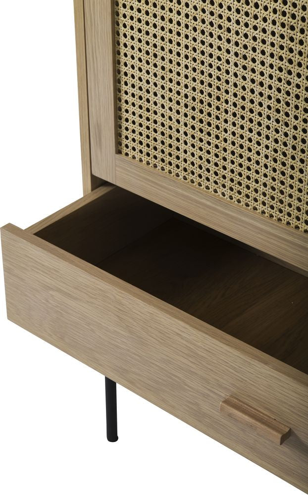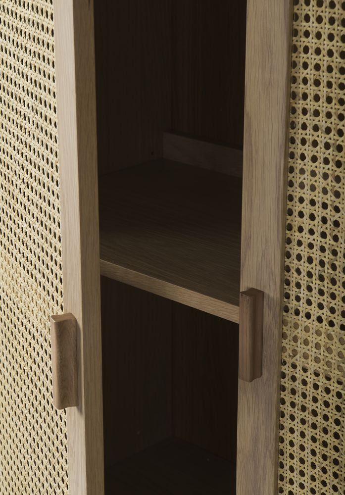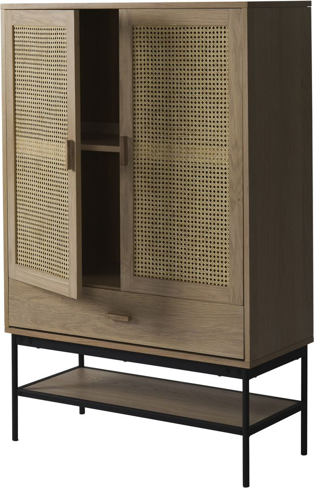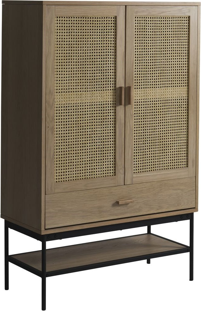 Ett högt och stilrent vitrinskåp i industriell design med en stomme i ekfanér och detaljer i svart metall.