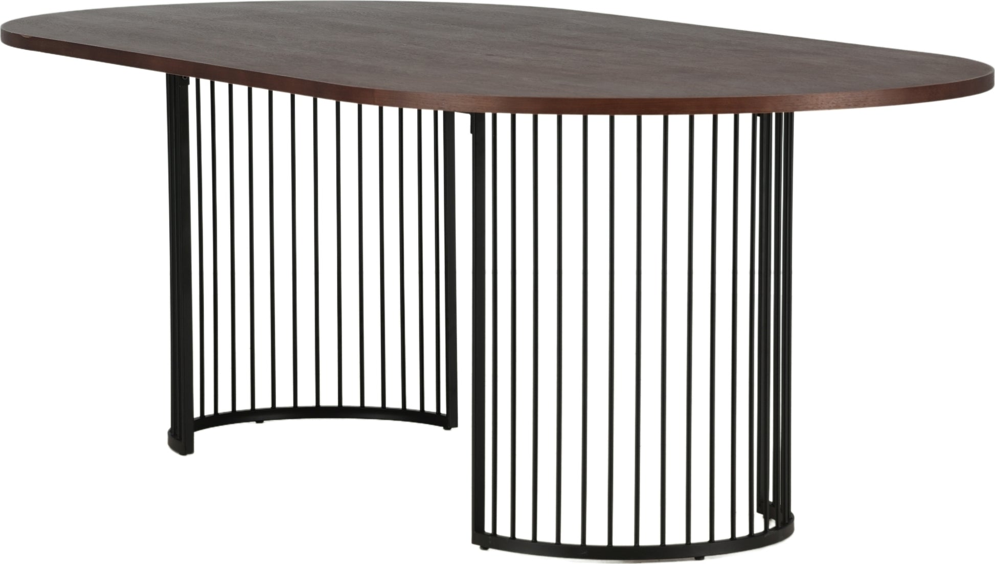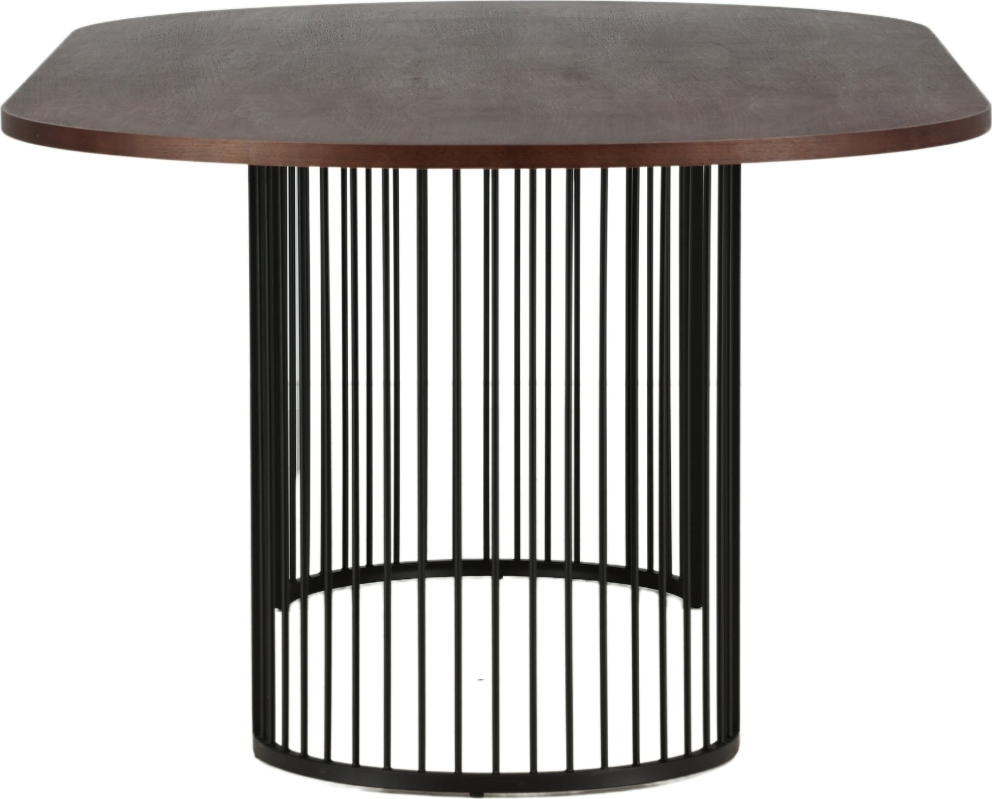 Elegant ovalt matbord med en skiva i mörkt trä (valnötsfanér) och ett dekorativt underrede i svart stål.