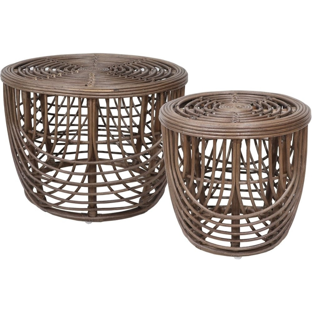 Set med två soffbord i rotting.