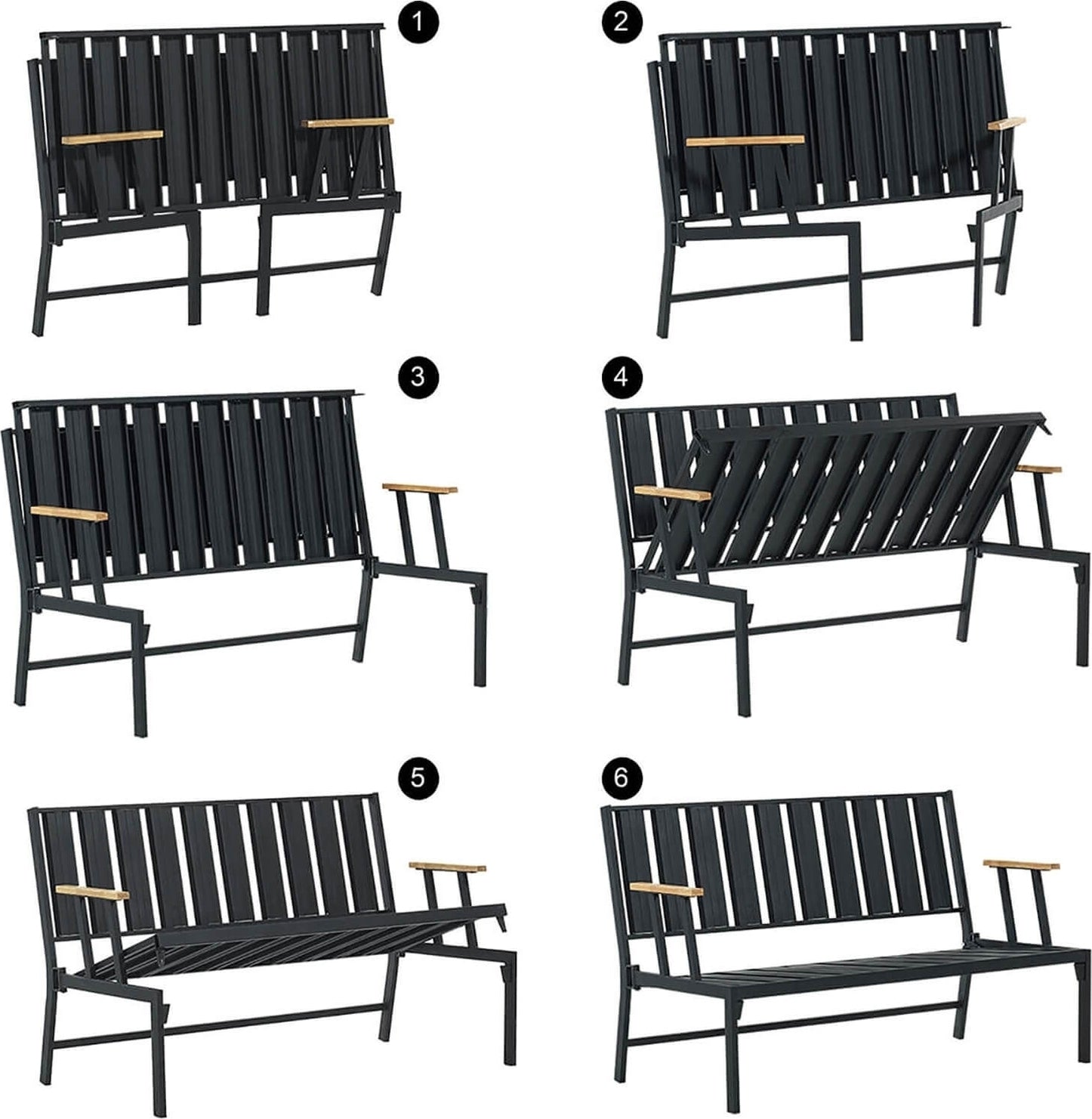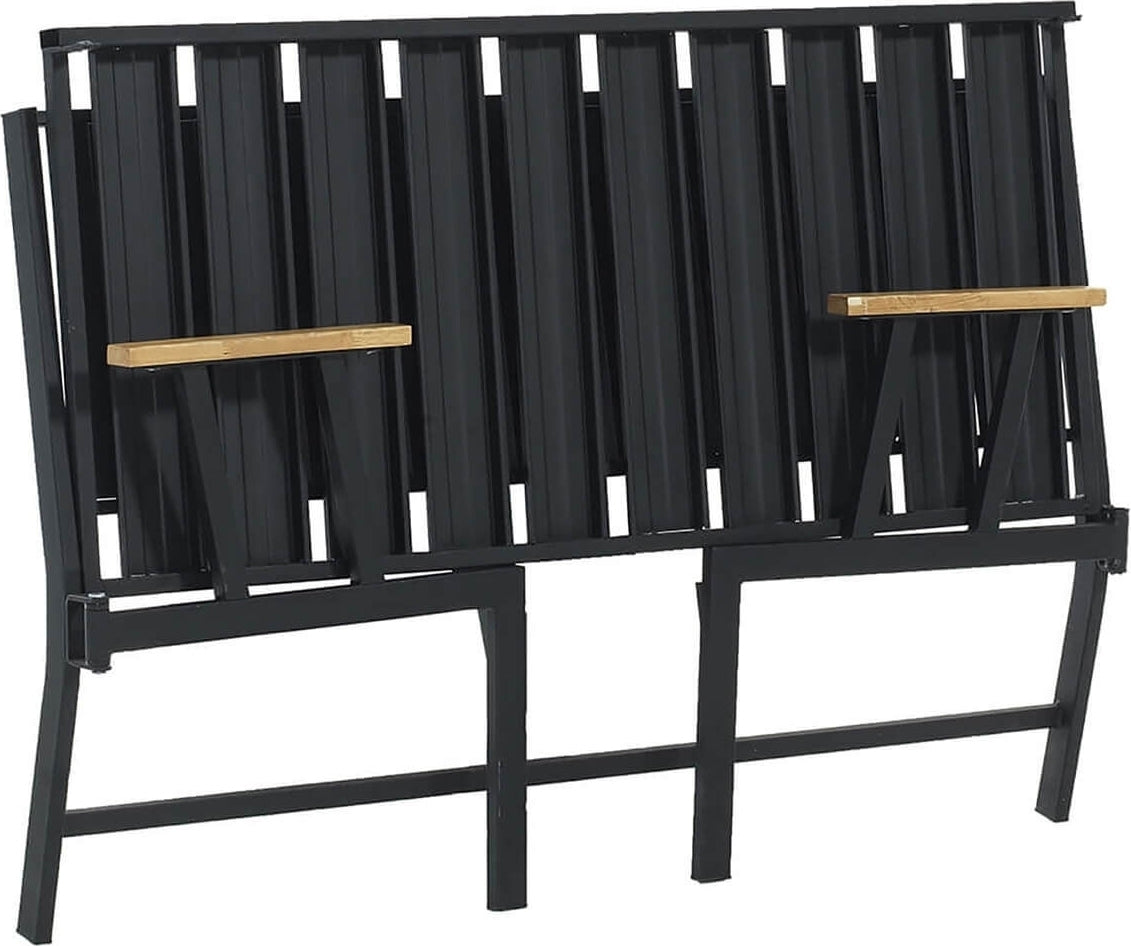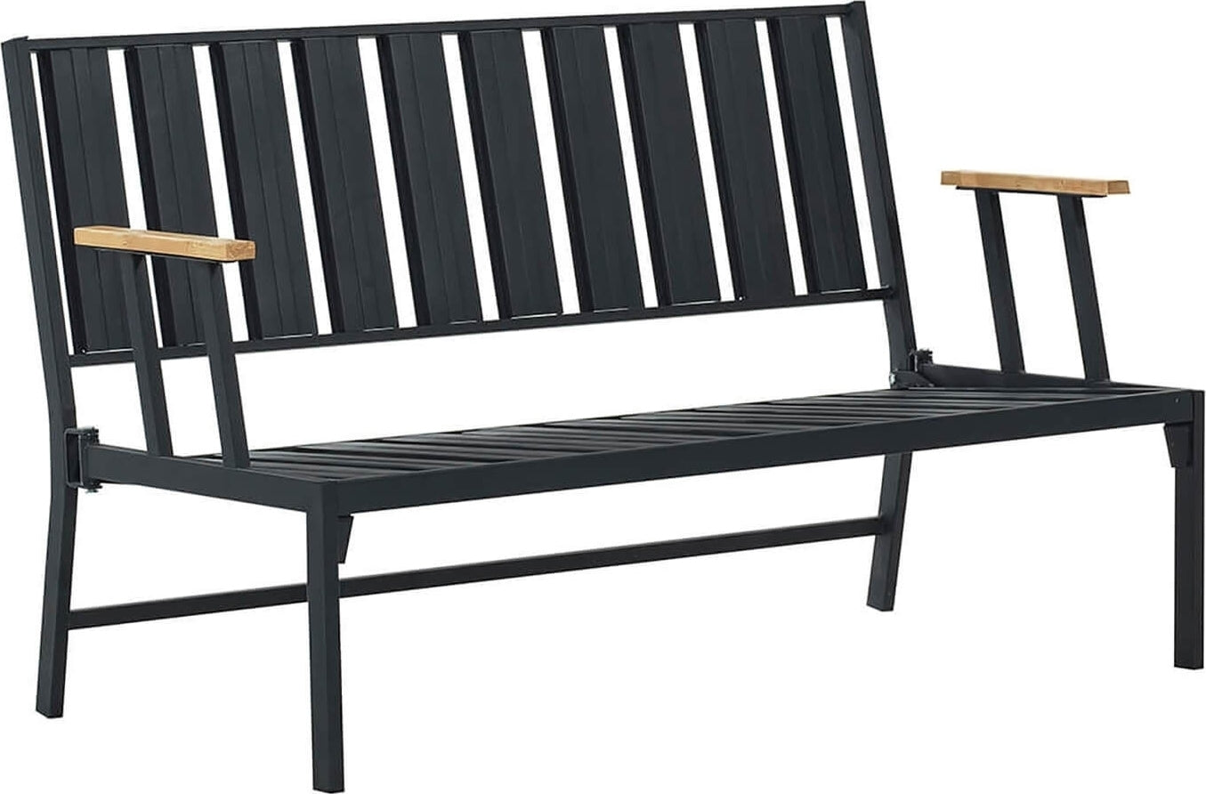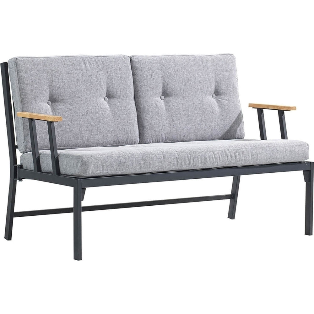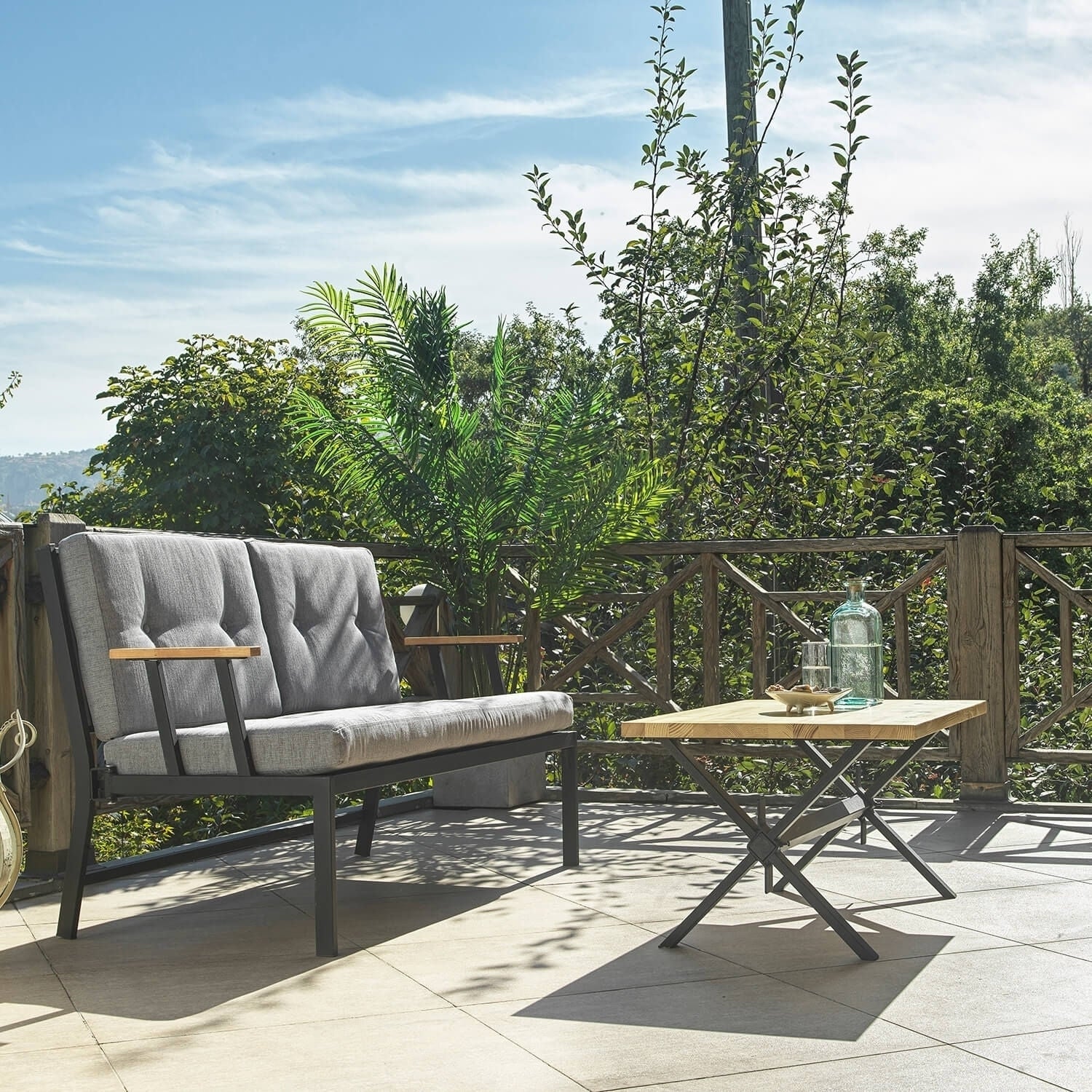 En modern 2-sits utesoffa med en stomme i svart aluminium och dynor i mörkgrått (fume) tyg.