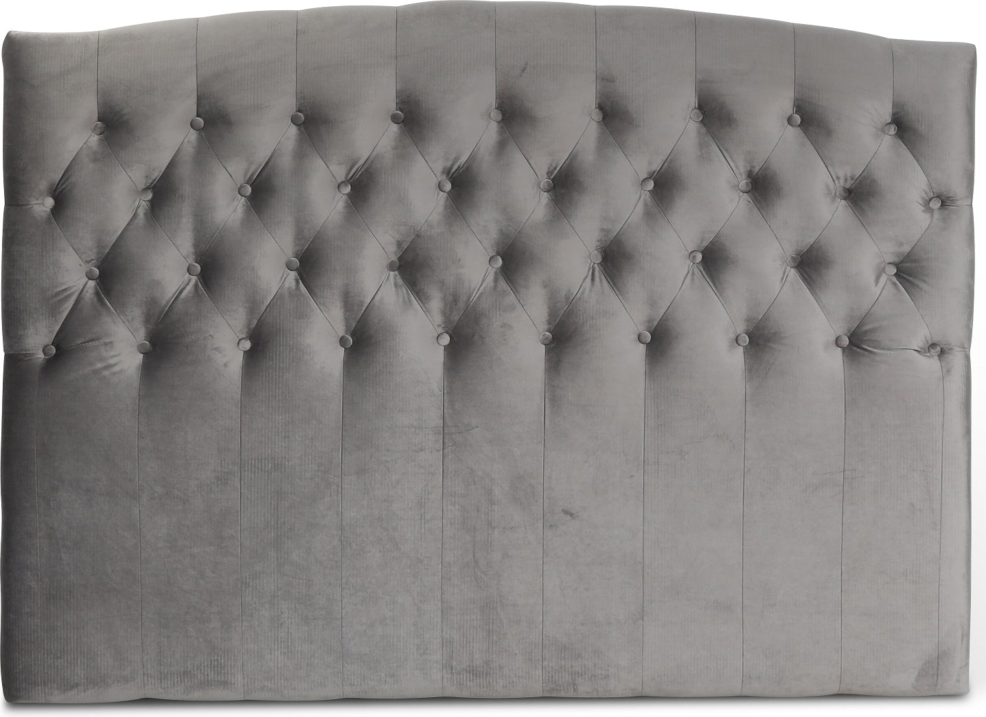 En hög och lyxig sänggavel med ett vackert mönster av djuphäftade knappar. Klädd i mjukt, grått sammetstyg.