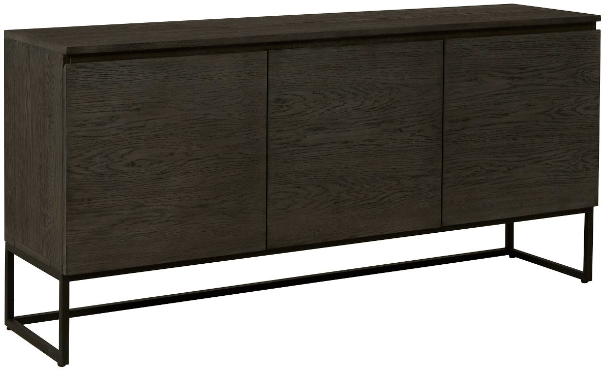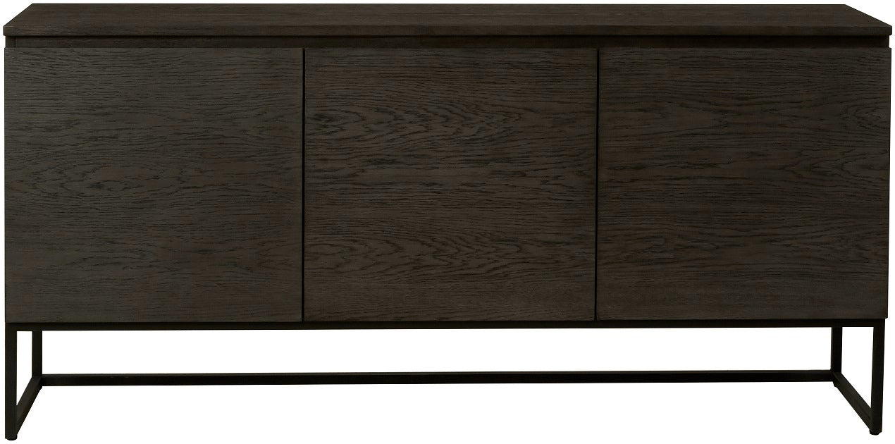 En robust och modern skänk i industriell design. Tillverkad i brunbetsad ekfanér med ett underrede och detaljer i svart metall.