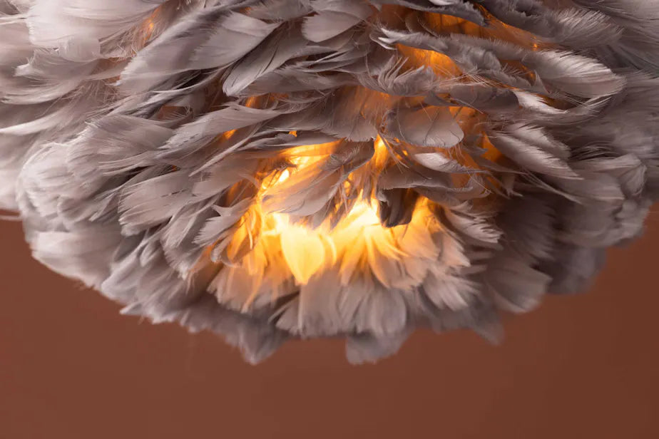 En unik och elegant taklampa med en skärm av fluffiga, grå konstfjädrar som skapar en mysig och lyxig atmosfär.