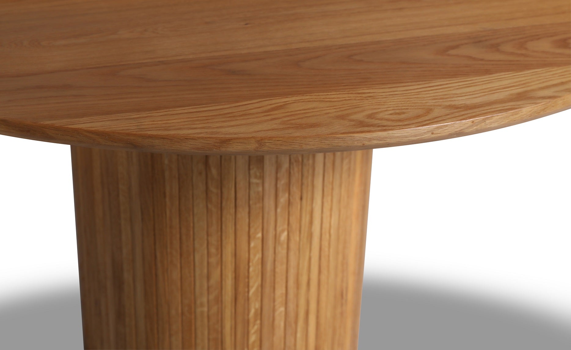 Ett modernt och stilrent runt soffbord i oljad ekfanér med ett stabilt underrede. Levereras i två delar.