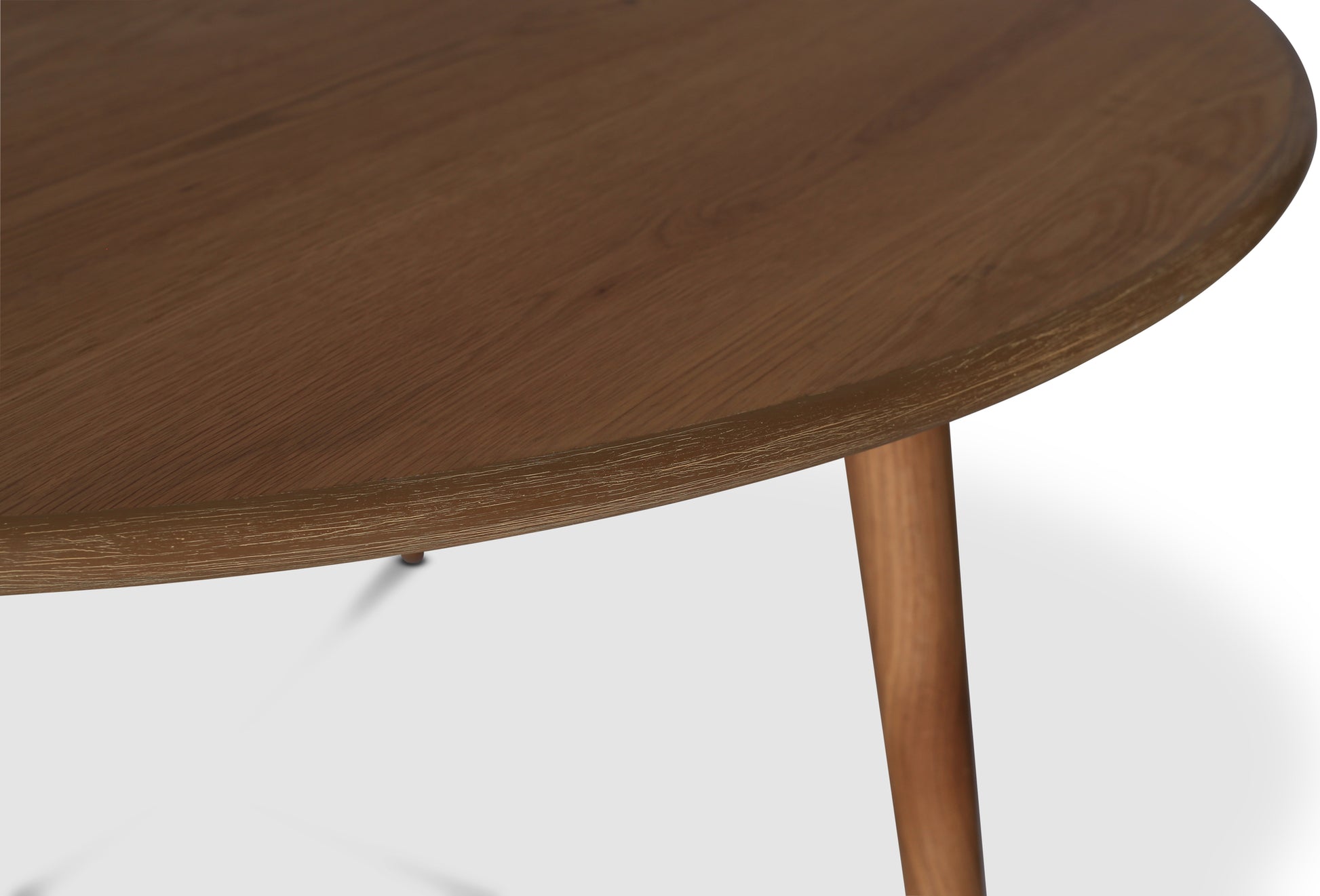 Ett stilrent och nätt runt matbord med toppskiva och ben i brunoljad ekfanér.