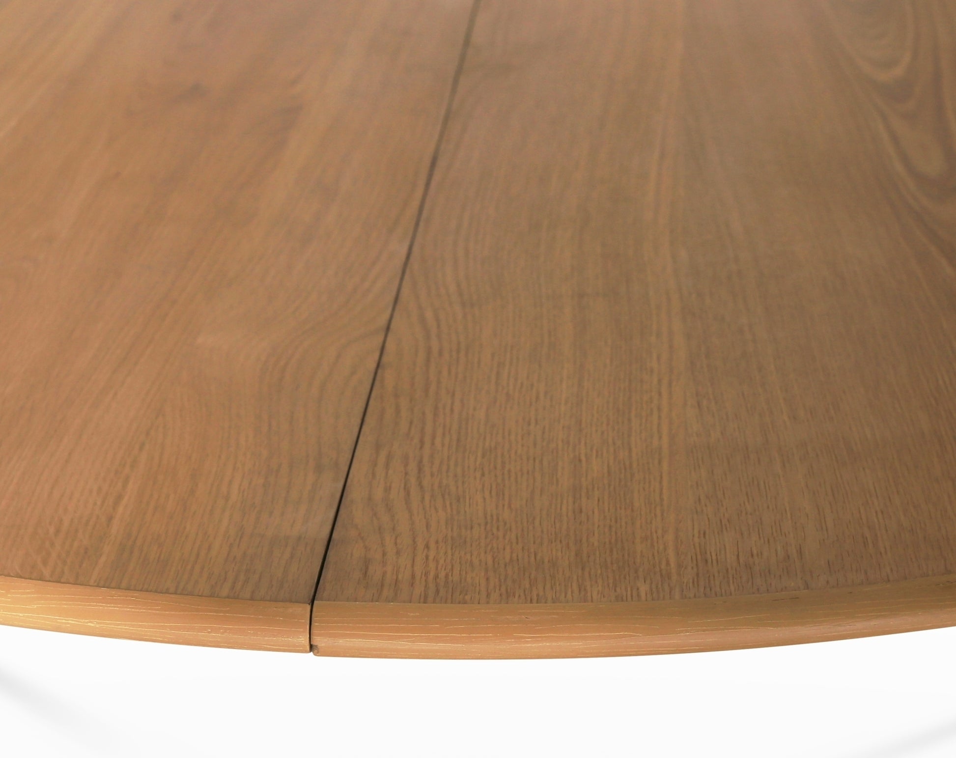 Ett stilrent och nätt runt matbord med toppskiva och ben i oljad ekfanér.