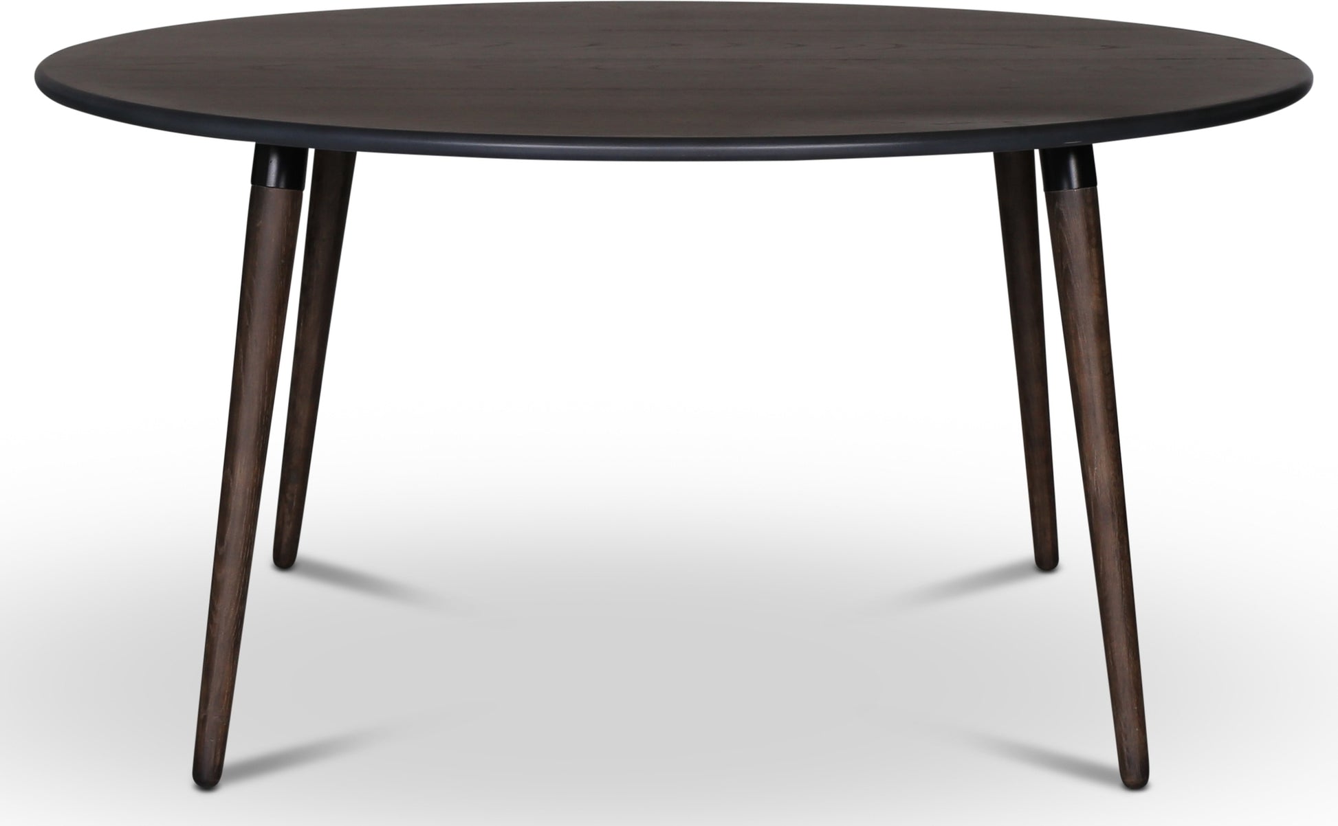 Ett stilrent och nätt runt matbord med toppskiva och ben i rökfärgad ek.