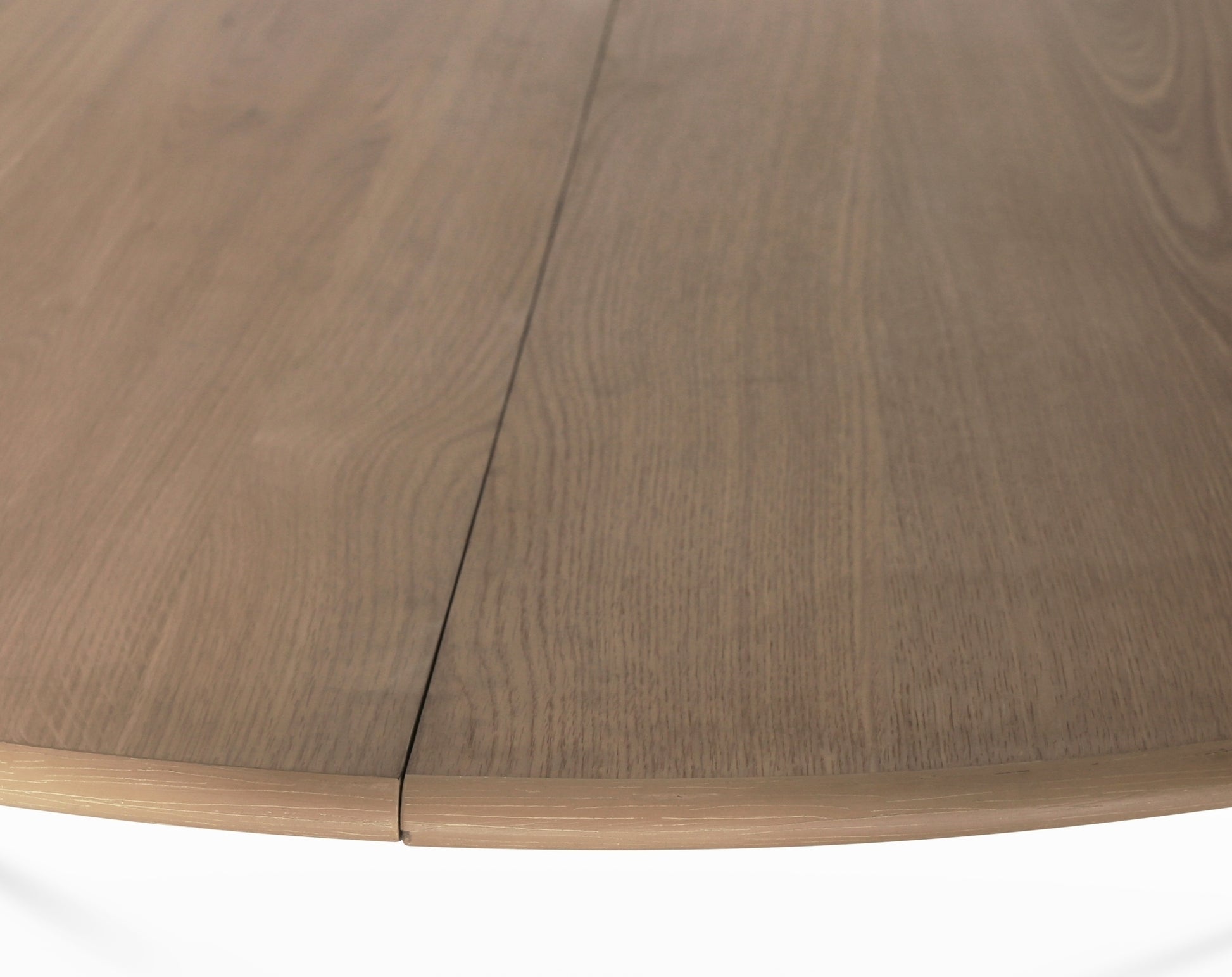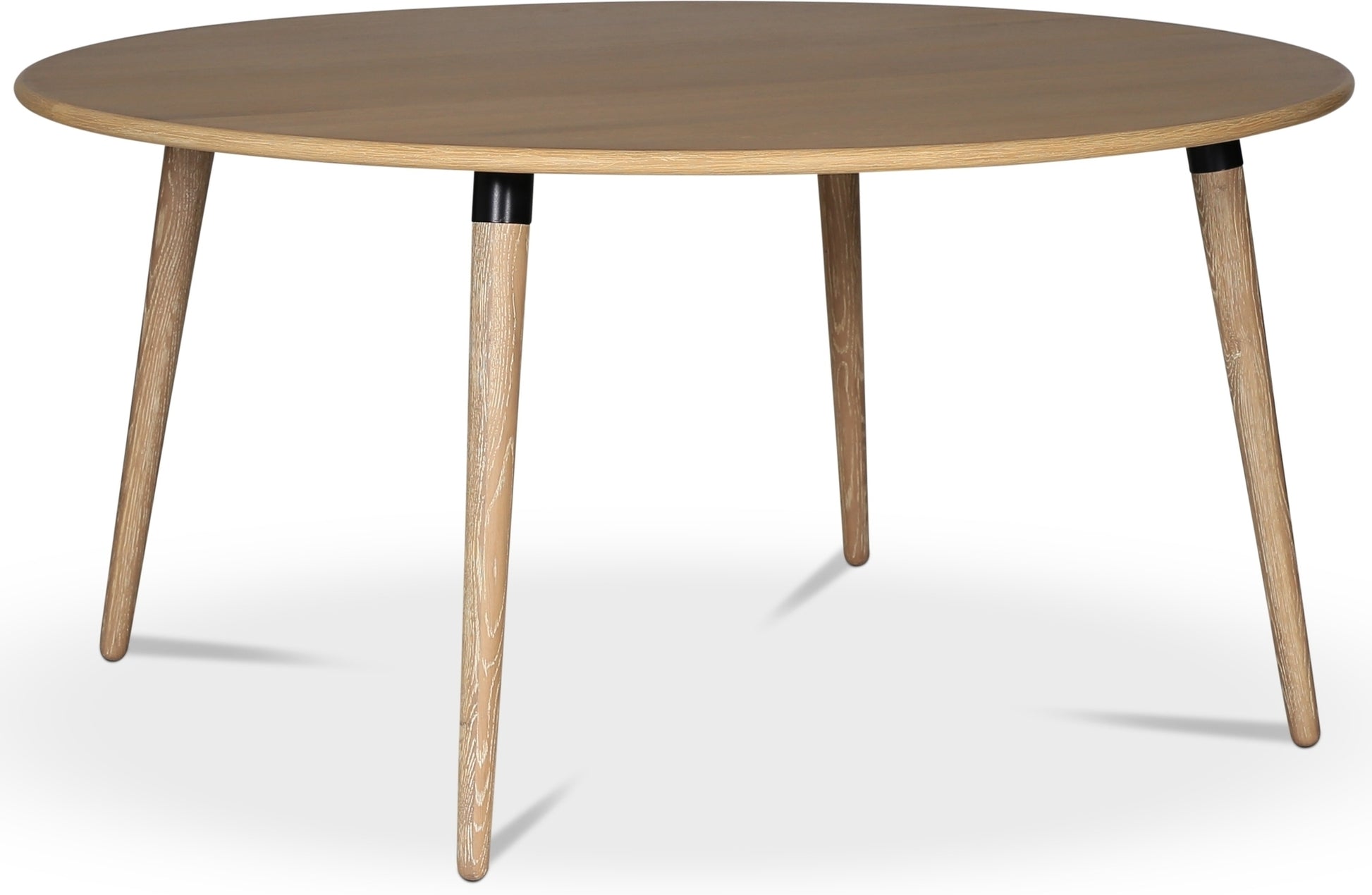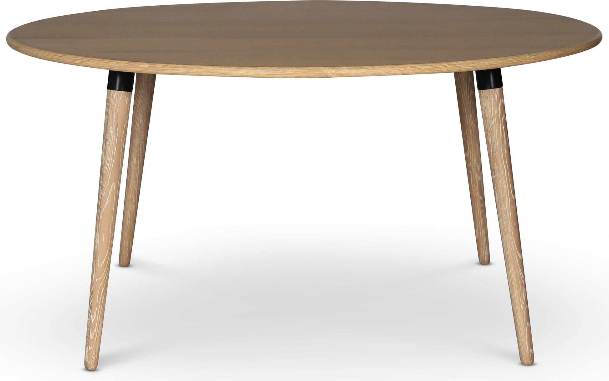 Ett stilrent och nätt runt matbord med toppskiva och ben i whitewash ek.
