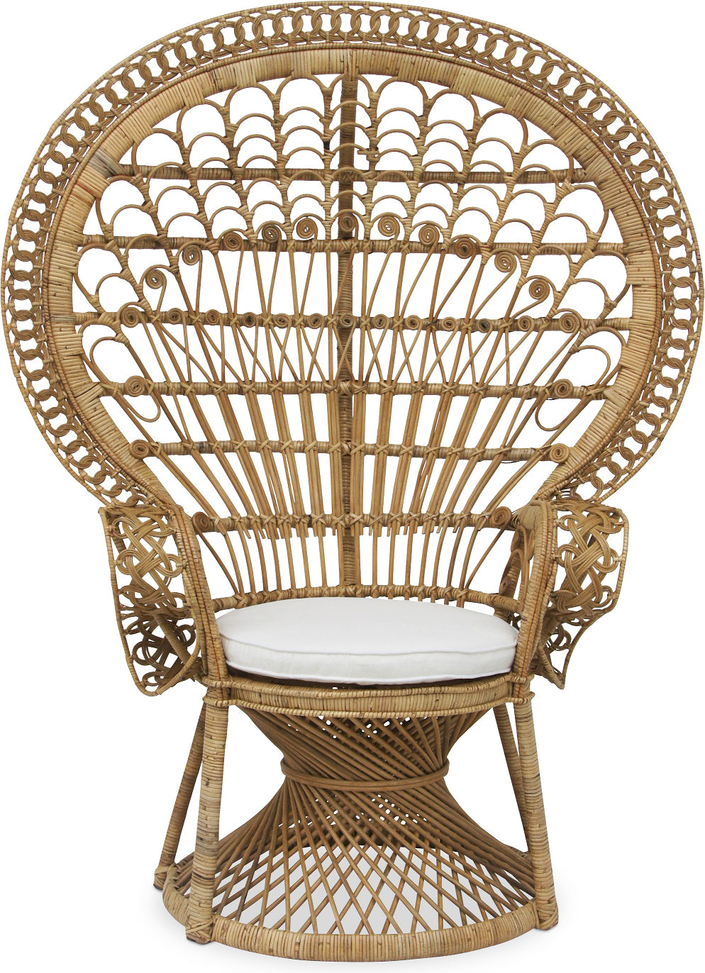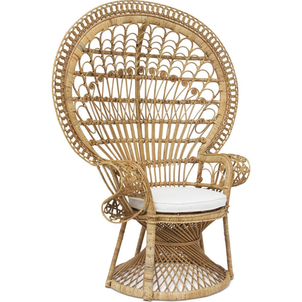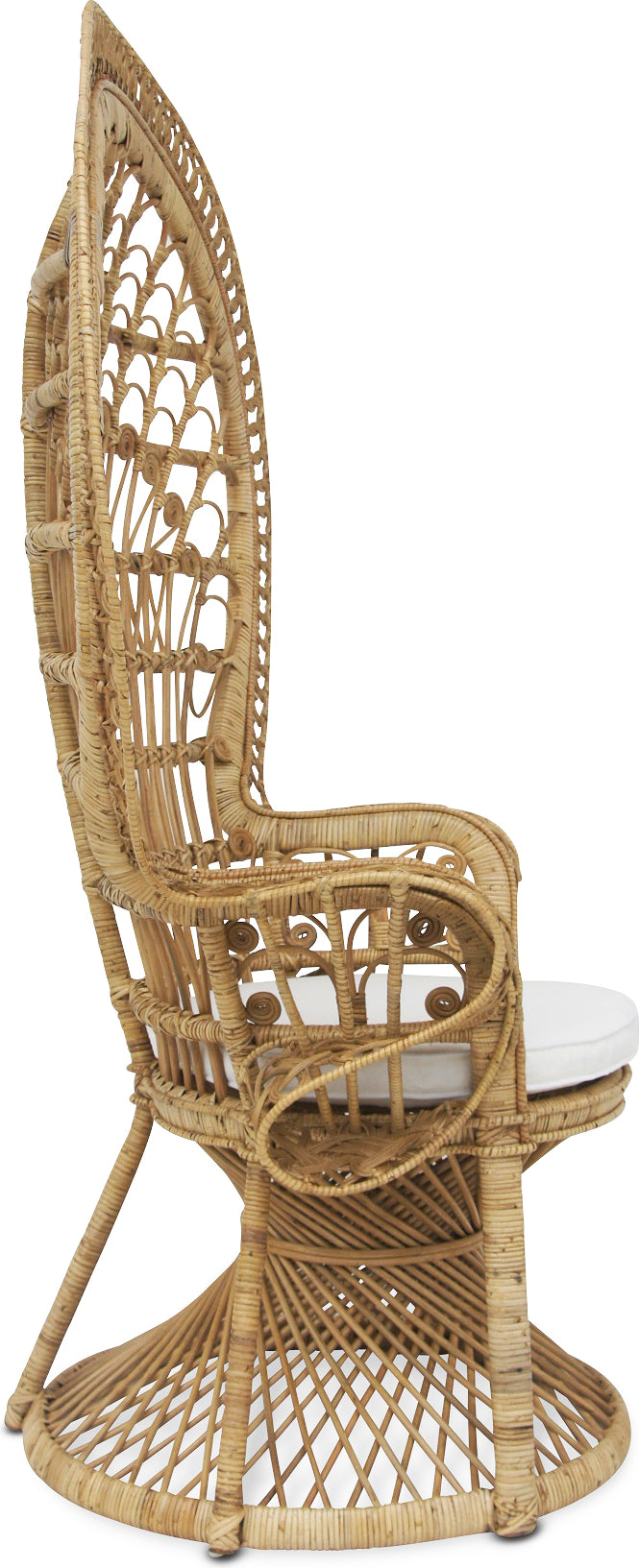 En majestätisk och iögonfallande fåtölj, handgjord i äkta rotting. Dess design liknar en påfågels fjäderskrud. Dyna ingår.