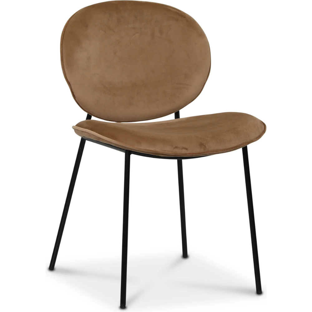 En modern matstol med en bekväm, rundad sits klädd i mjukt brunt sammetstyg. Står på smala ben av svart metall.