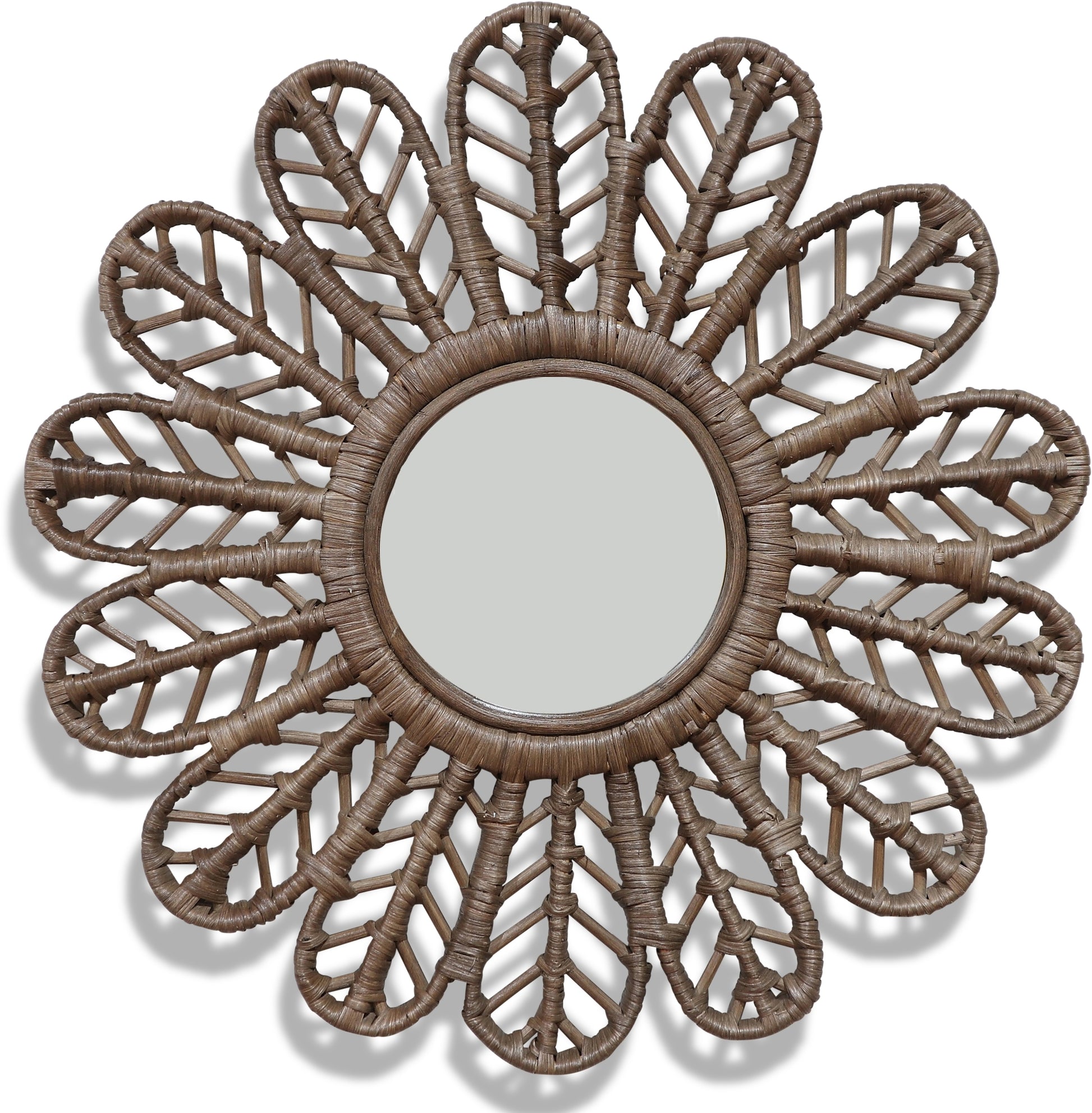 En vacker och dekorativ spegel med en ram av brunbetsad rotting som liknar en påfågels fjäderskrud.