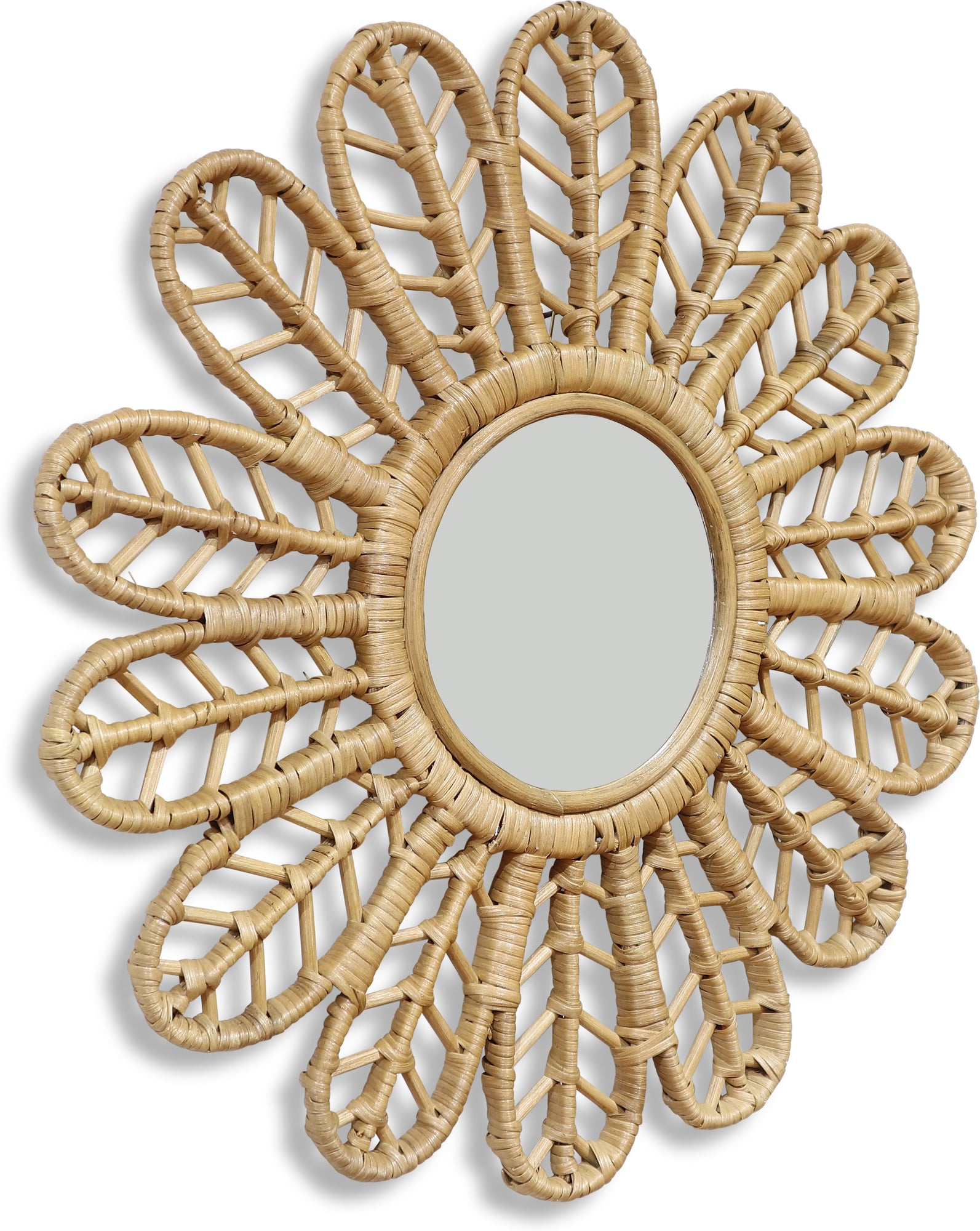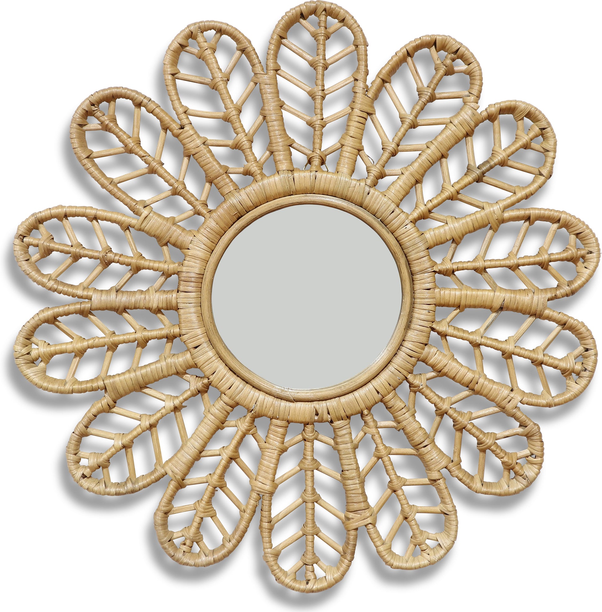 En vacker och dekorativ spegel med en ram av ljus rotting som liknar en påfågels fjäderskrud.