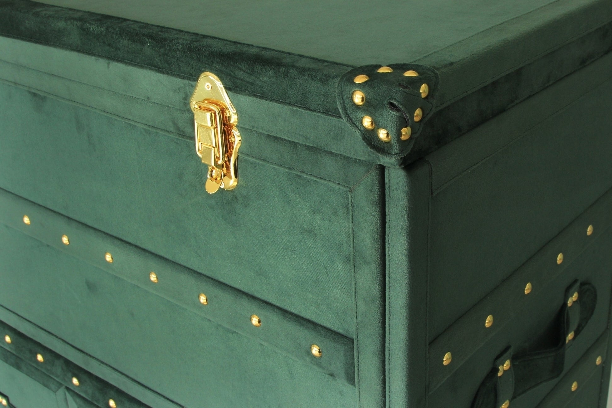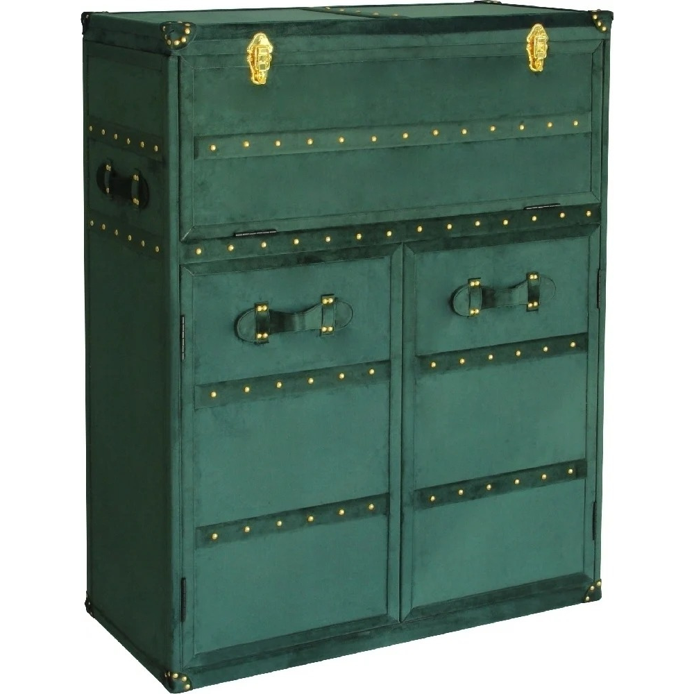 En koffert med förvaring och utfällbar skiva med inbyggd spegel. Kan användas som sminkbord, barskåp eller skrivbord.