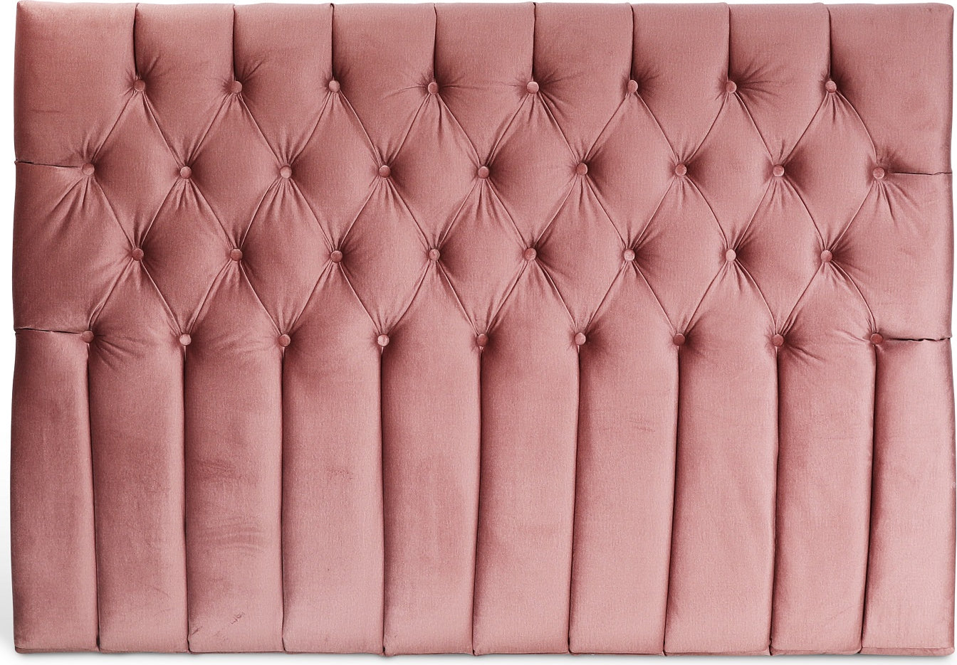 En hög och lyxig sänggavel med ett vackert knapp-mönster. Klädd i ett mjukt, rosa sammetstyg som ger en exklusiv känsla till sovrummet.