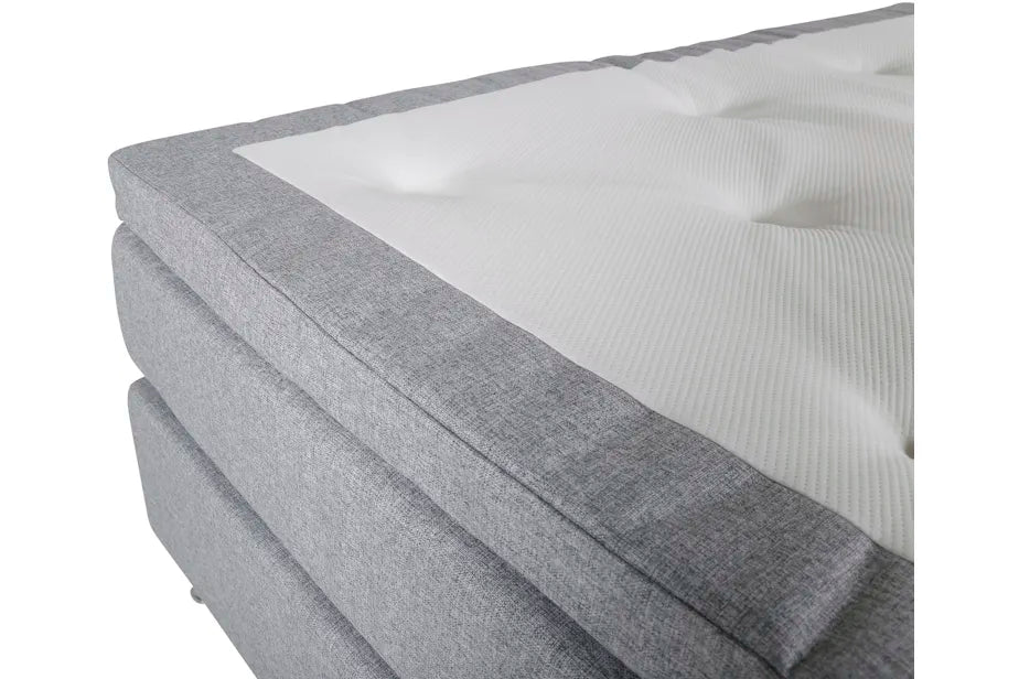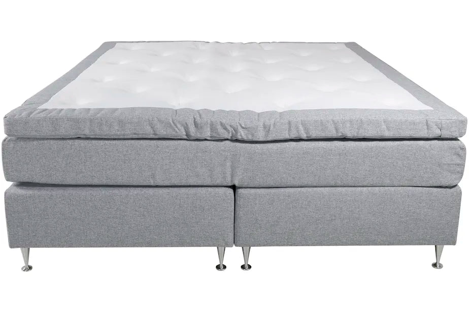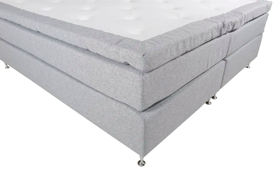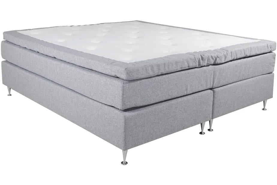 Rättvik, en modern kontinentalsäng i ett ljusgrått slitstarkt polyestertyg och medium hårdhet. Investera i din hälsa och hitta en säng som matchar din sovstil och dina behov.