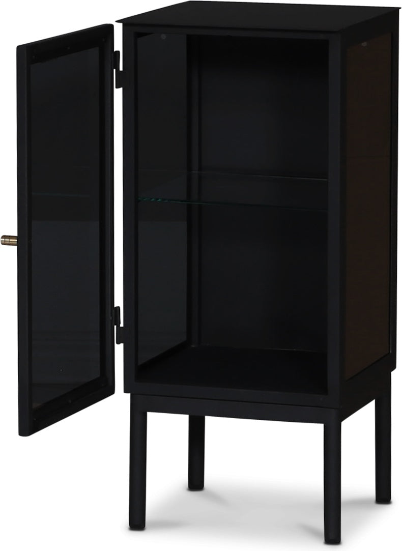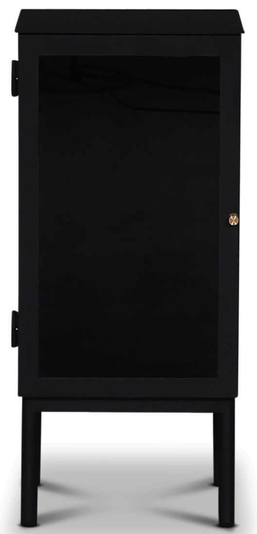 Ett högt sängbord i svart metall med en vänsterhängd dörr och toppskiva i mässingsfärgad metall.