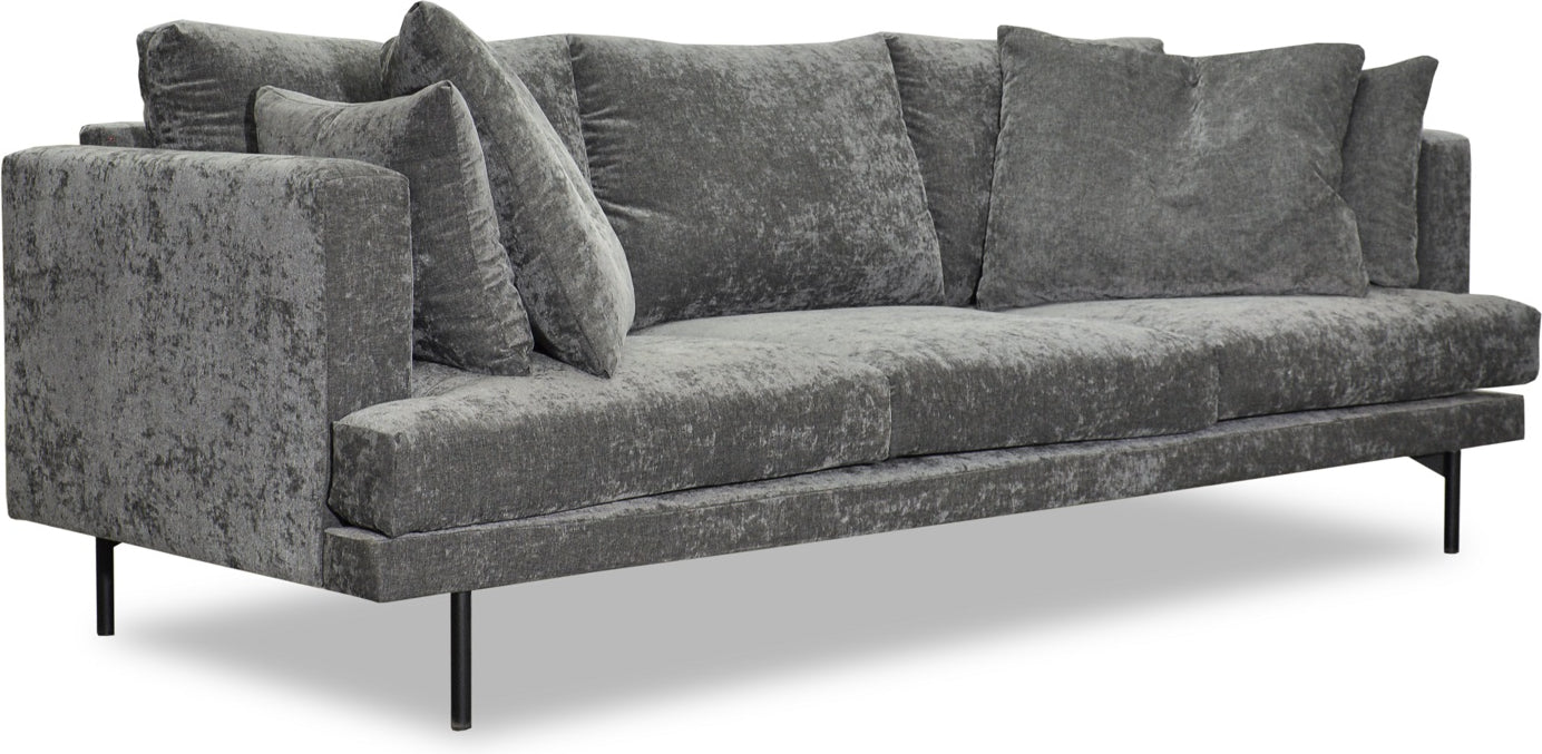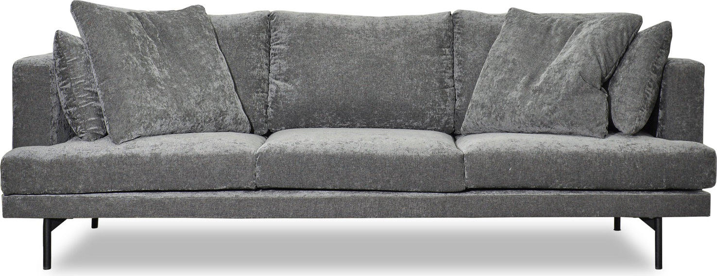 En stilren 3-sits soffa i retrodesign med fast klädsel i ett grått tyg och höga, snedställda ben i svart metall.