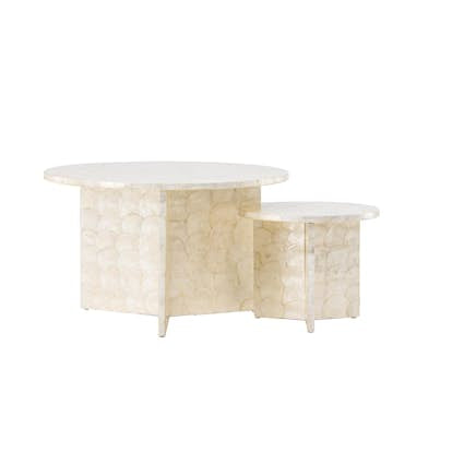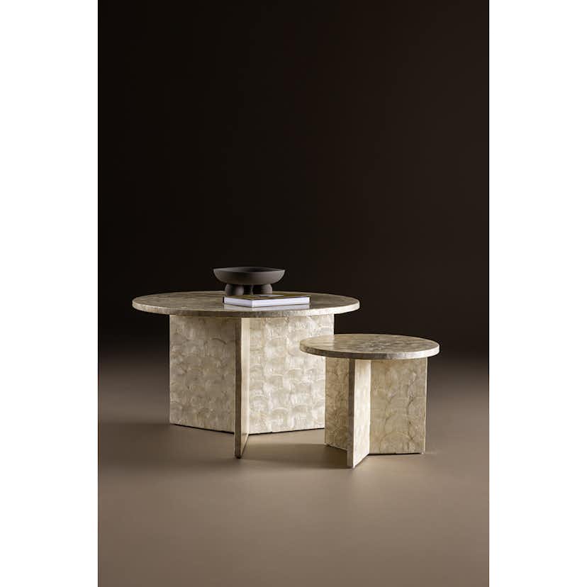 Smögen är ett elegant set med två stilrena bord tillverkade i det vackra materialet Capiz. De två borden kommer i olika storlekar – ett större med en diameter på 70 cm och ett mindre med en diameter på 40 cm. Perfekta att kombinera tillsammans, där det mindre bordet smidigt kan skjutas in delvis under det större för att skapa en flexibel och dynamisk inredningslösning.