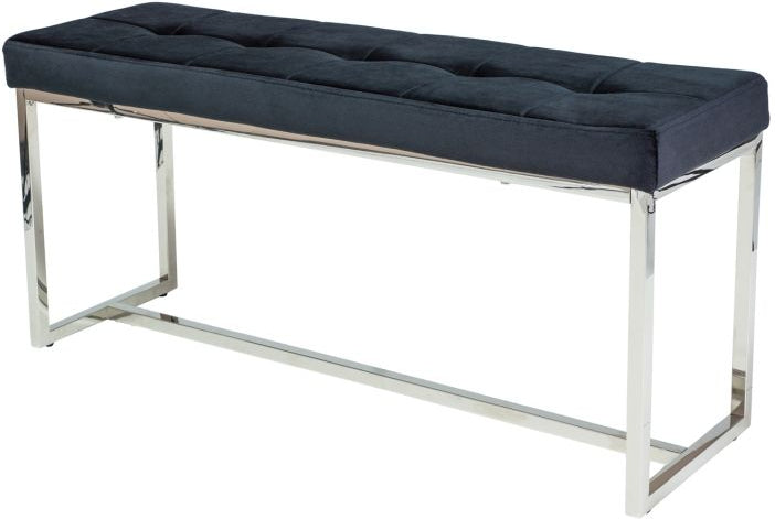En stilren och lyxig sittbänk med en sits klädd i mjuk, svart sammet och ett underrede i blank krom.
