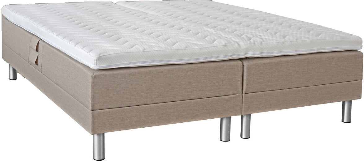 En ställbar säng av hög kvalitet med 5-zons pocketmadrass, trådlösa fjärrkontroller och metallben. Klädsel i tyg Rocco 281.