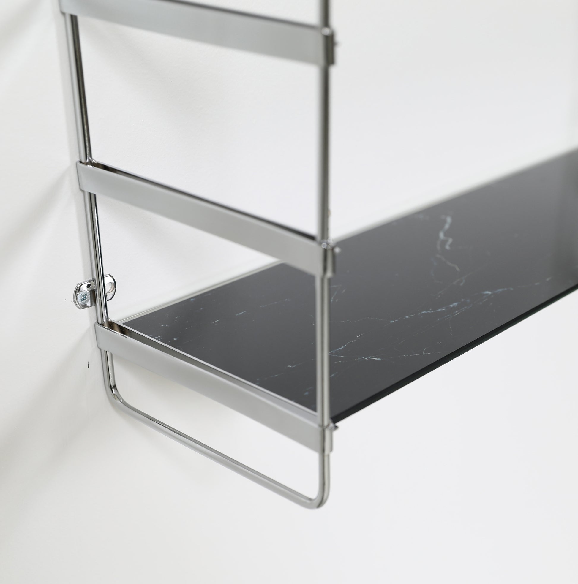 Ett set med fyra hyllplan i svart, marmorerat säkerhetsglas. Avsedda att kombineras med stomme från Linus-serien.