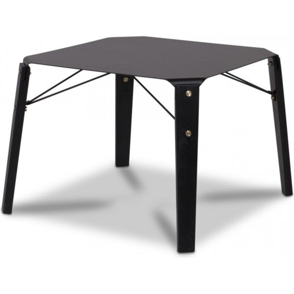 Ett elegant fyrkantigt soffbord med en toppskiva i metall och ett underrede i svart målat trä.