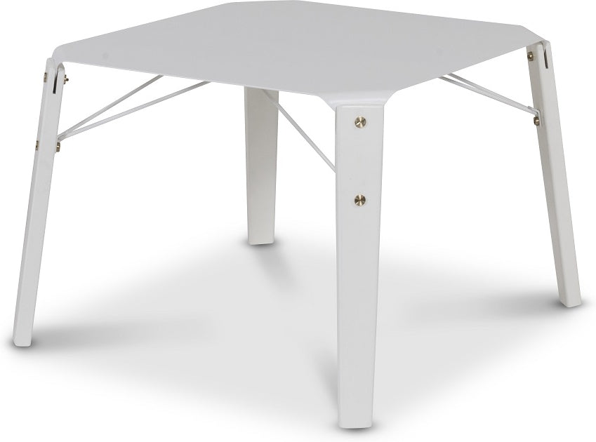 Ett elegant fyrkantigt soffbord med en toppskiva i metall och ett underrede i vit målat trä.