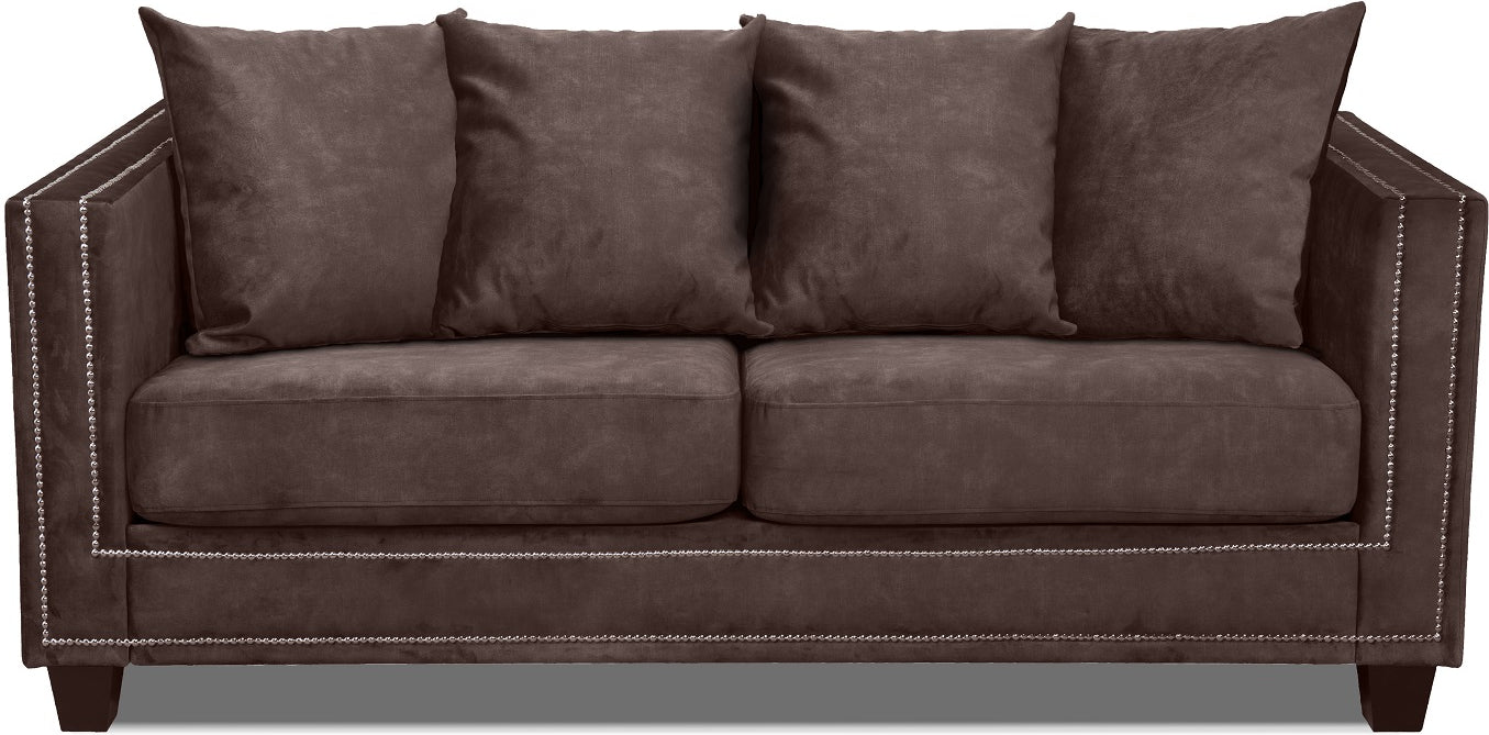 En elegant 2-sits soffa i howard-stil med vackra detaljer som nitar och svarvade ben, klädd i ett lyxigt brunt sammetstyg.