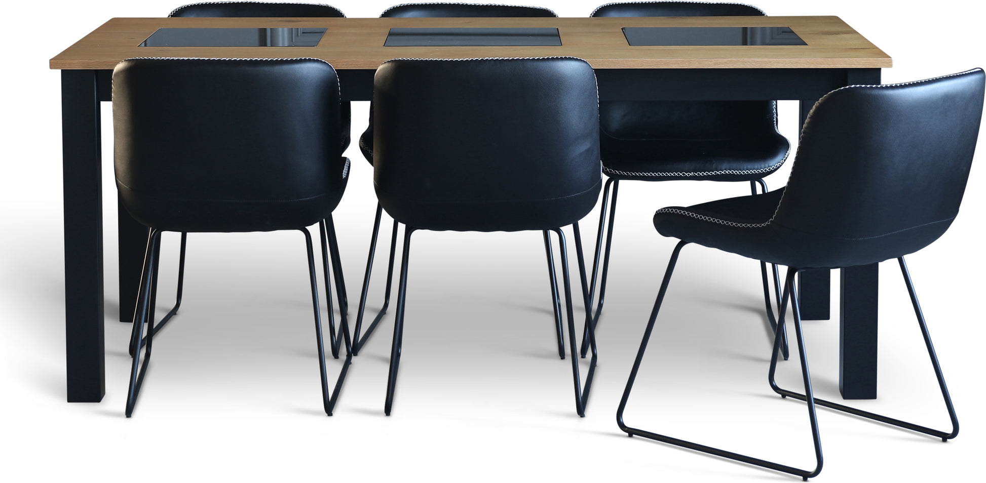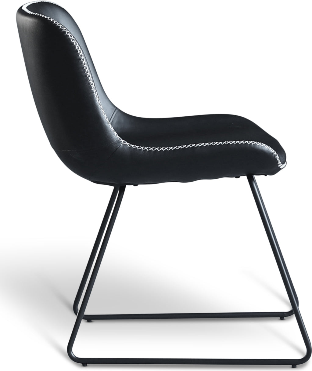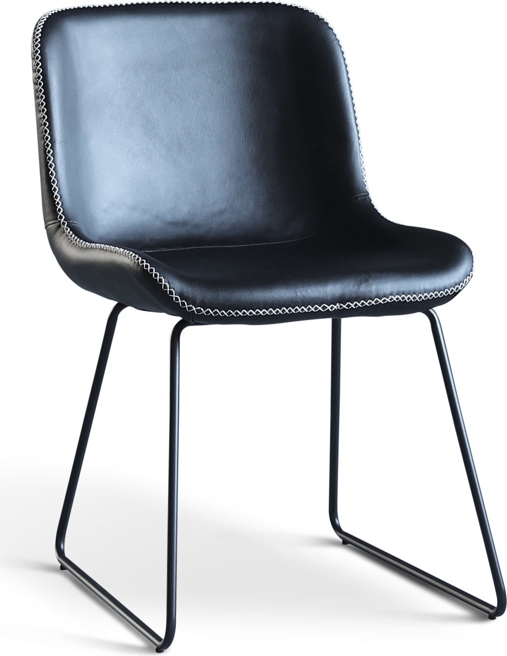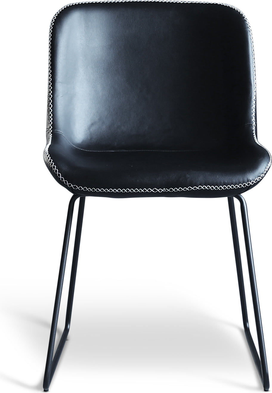 En matstol i industristil med klädsel i svart konstläder, dekorerad med en ljus kontrastsöm.