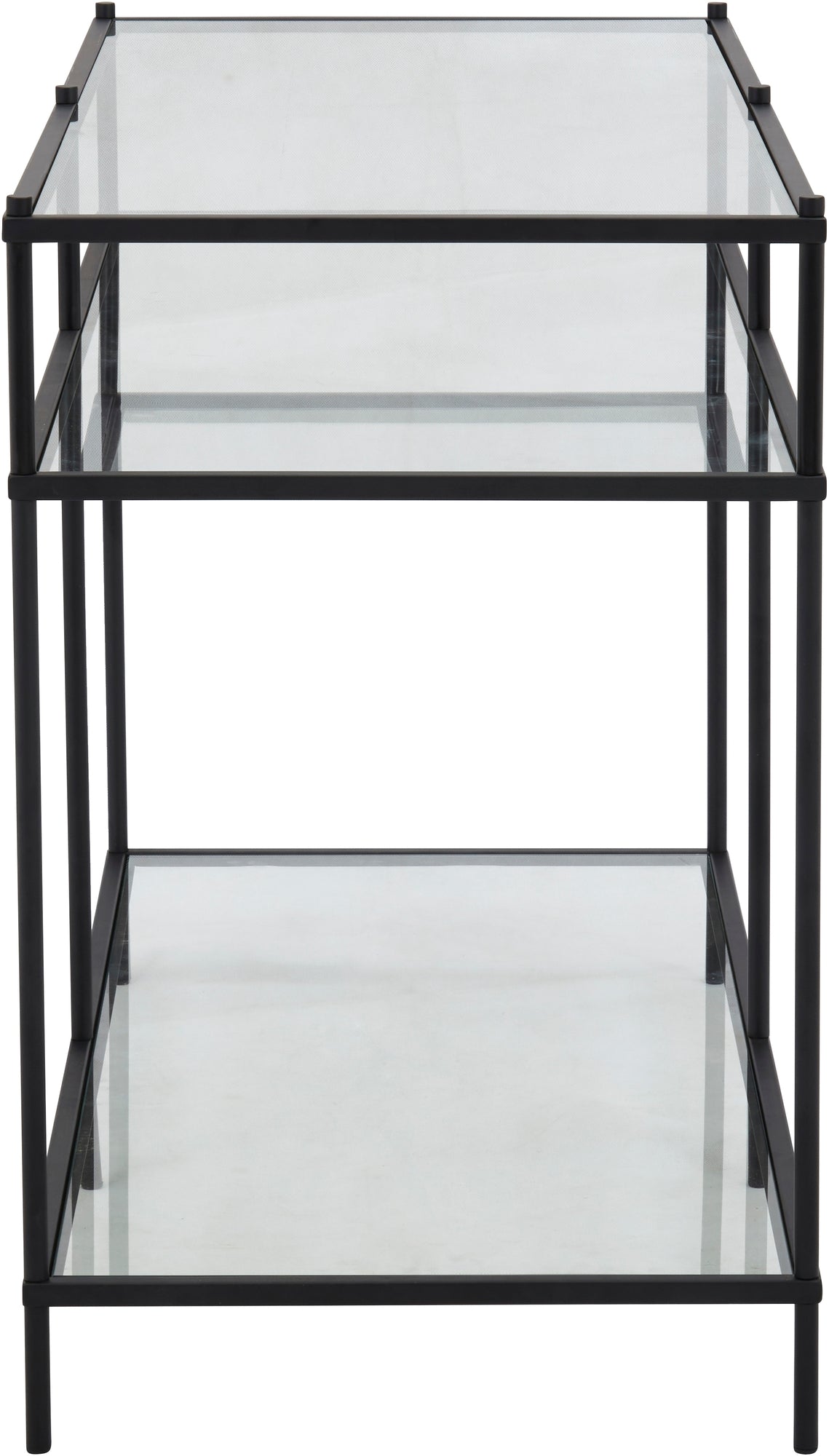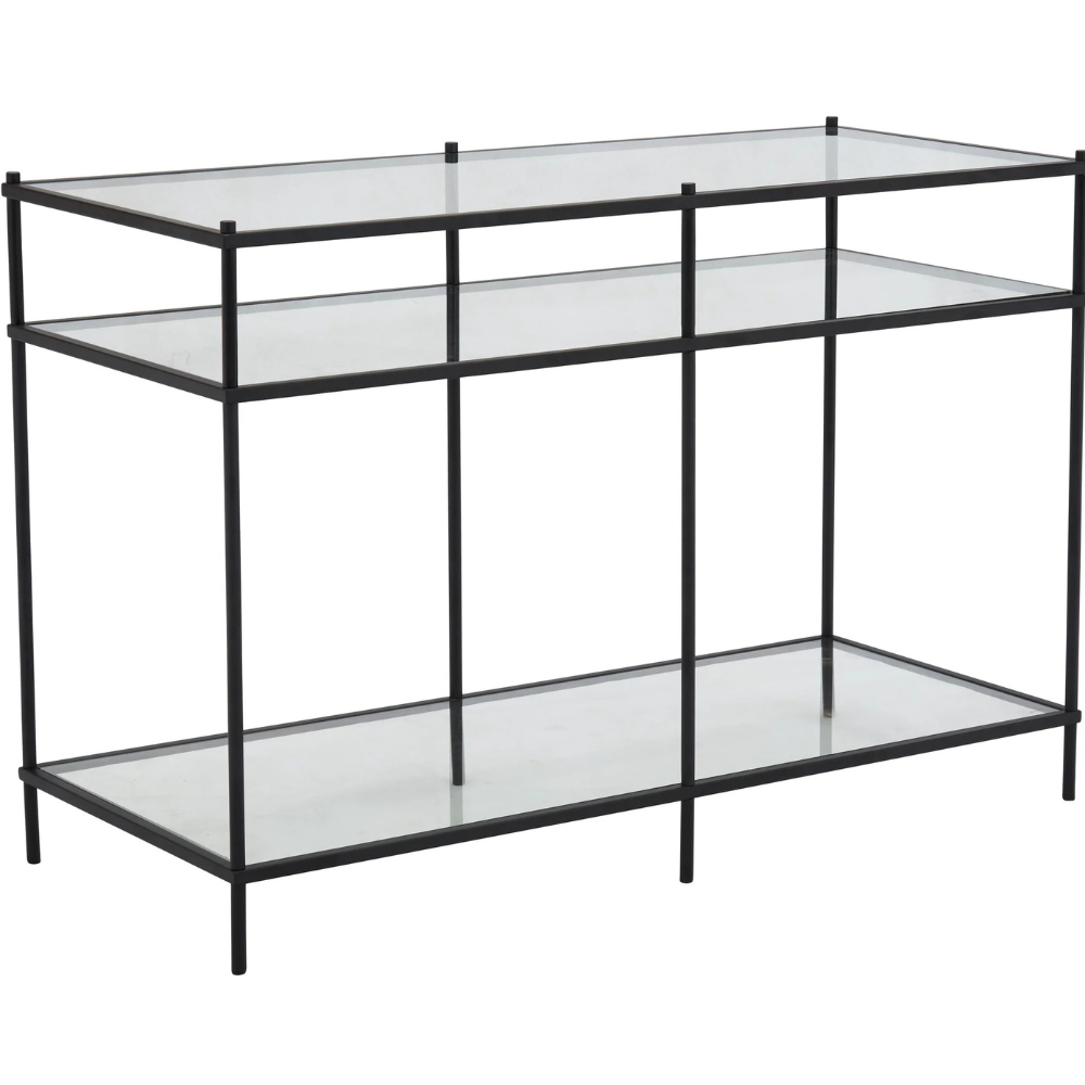Ett elegant avlastningsbord med ett vackert, dekorativt underrede i svart metall och en toppskiva i härdat glas.